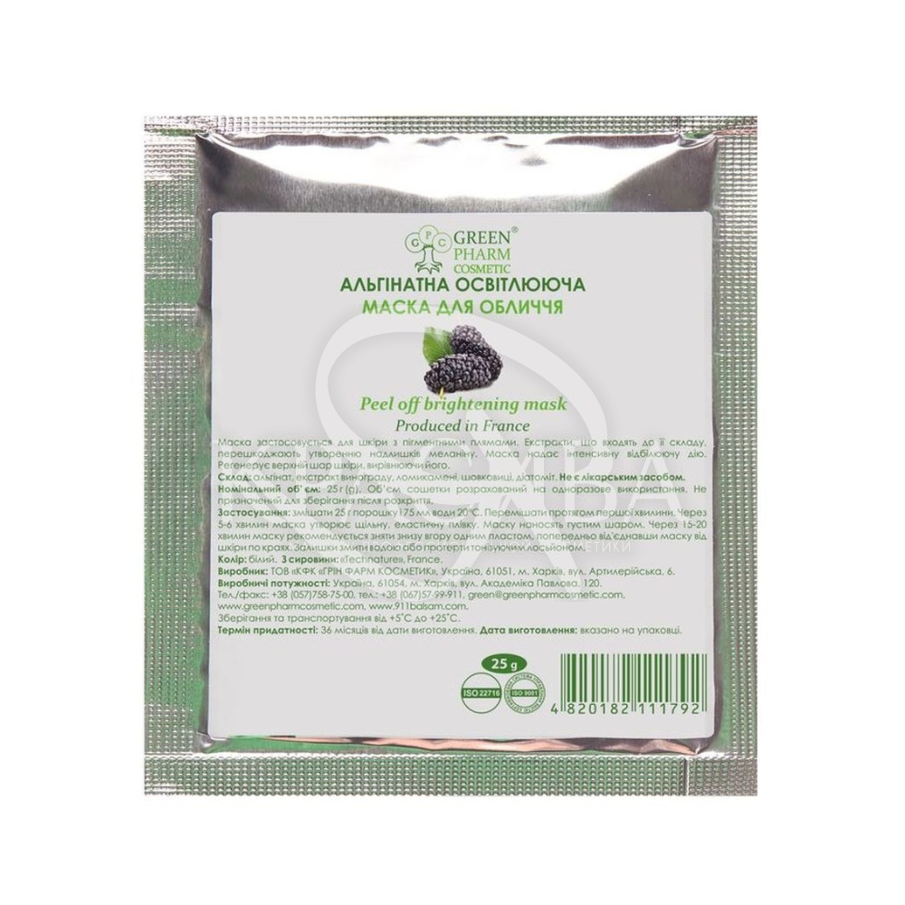 Состав: Альгинат, экстракт шелковицы, винограда, камнеломки, диатомит.