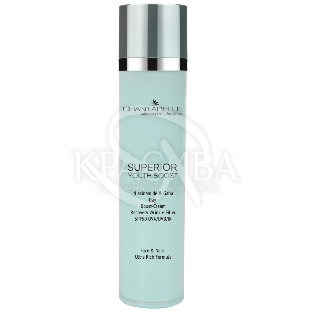 Описание: Дневной крем Boost SPF50 с ниацинамидом и ГАМК восстанавливает защитный барьер кожи и стимулирует выработку коллагена.