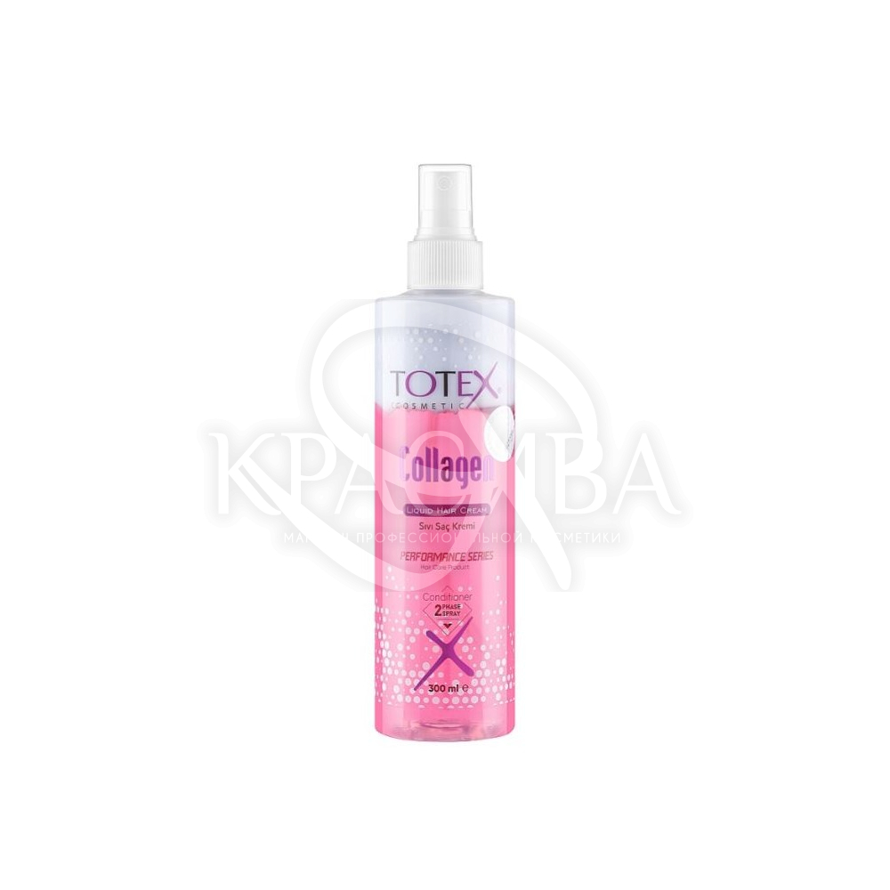 Описание: Несмываемый двухфазный жидкий спрей-крем Totex Liquid Hair Cream Collagen с коллагеном дисциплинирует и увлажняет волосы. Придает блеск и шелковистость, закрывает кутикулу, облегчает расчесывание и укладку. Средство защищает от воздействия окружающей среды и воздействия высоких температур. Подходит для всех типов волос.