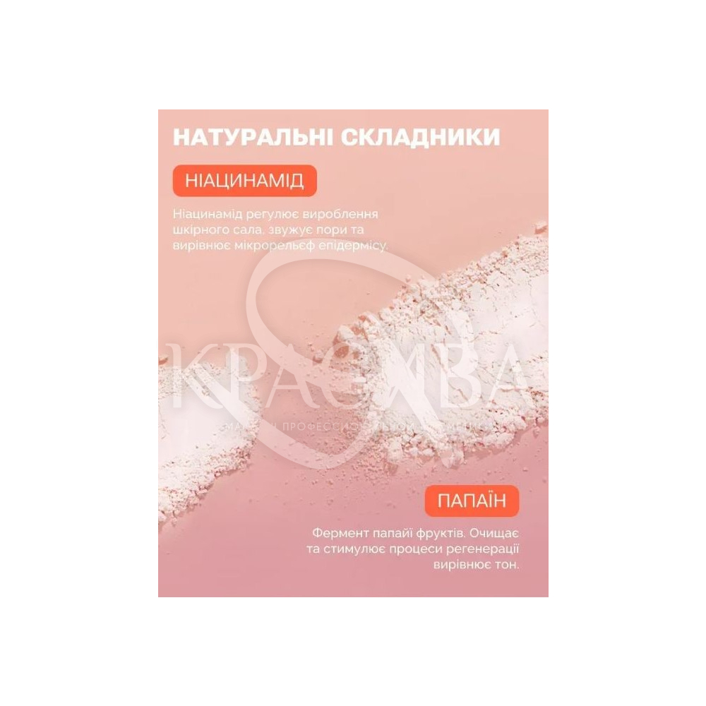 Состав: Talc, Sodium Bicarbonate, Oryza Sativa (Rice) Powder, Sodium Cocoyl Isethionate, Papain, Tapioca Starch, Niacinamide, Citric Acid, Protease, Subtilisine, Cyanocobalamin.