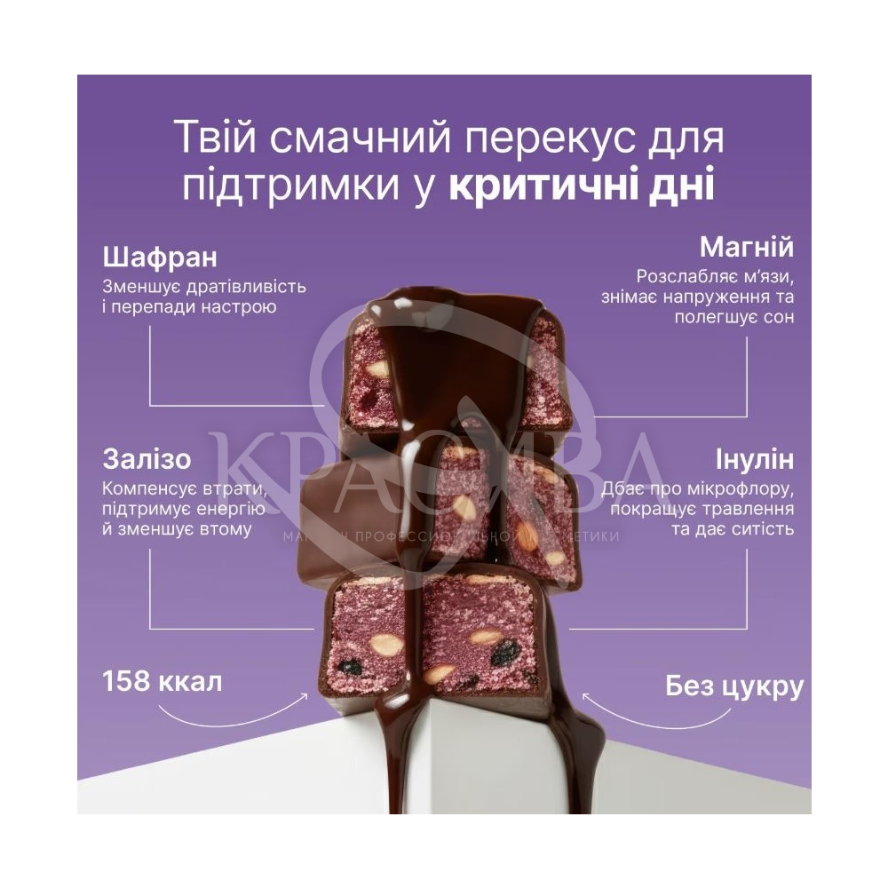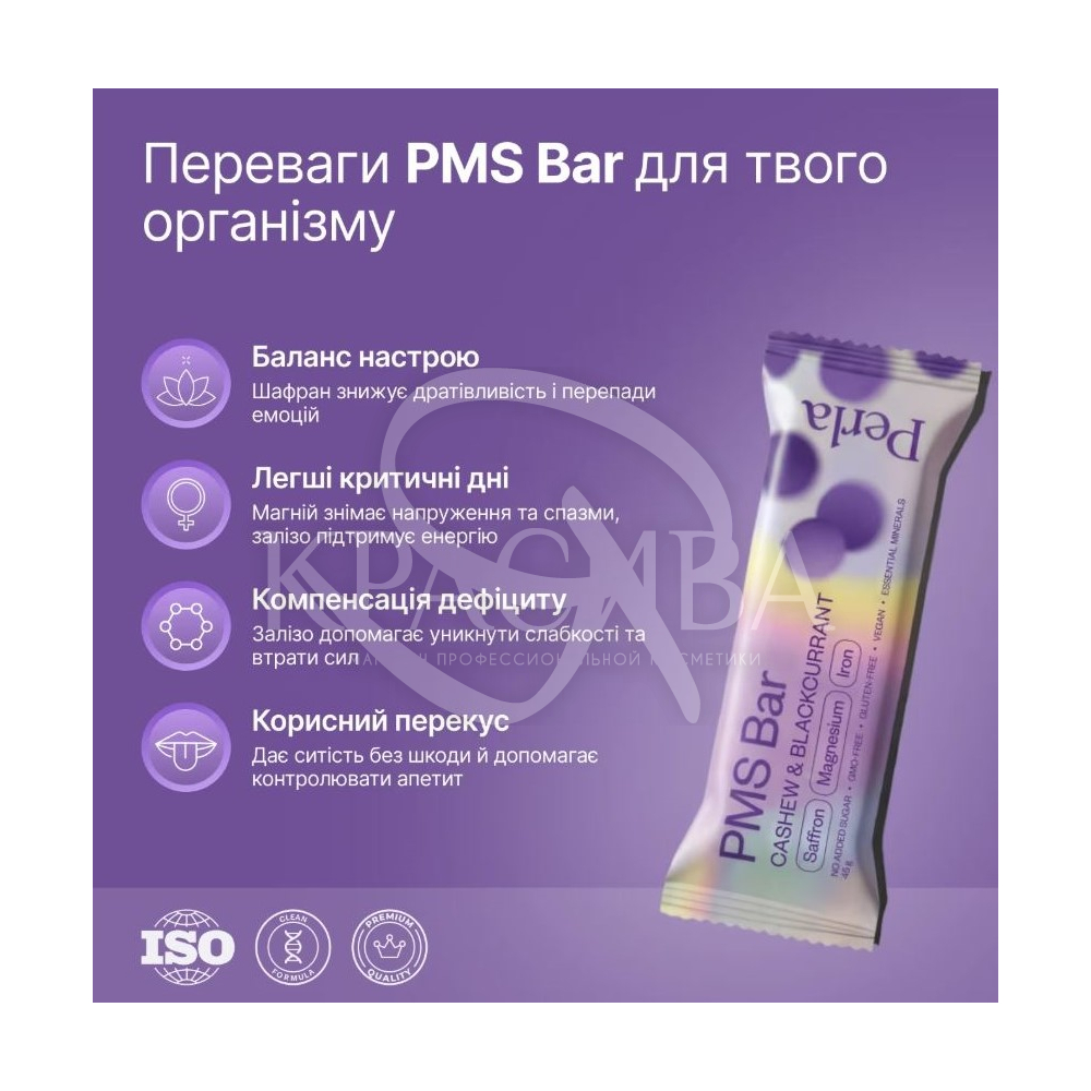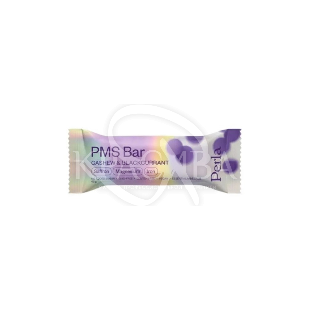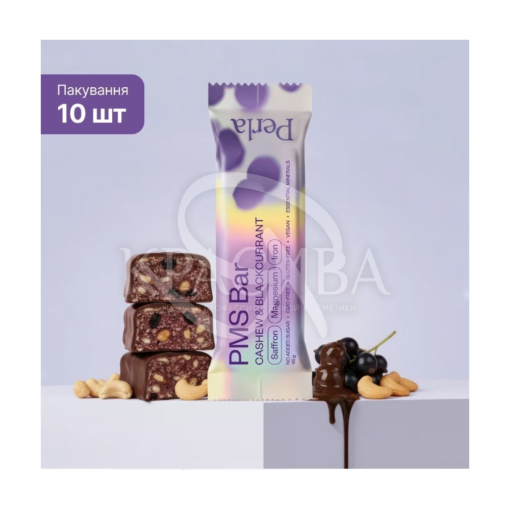 Описание: PMS Bar – функциональный батончик, разработанный для поддержания эмоционального баланса и энергии во время критических дней. Сочетает вкус черной смородины с кешью и специально подобранные ингредиенты для снижения стресса и усталости.