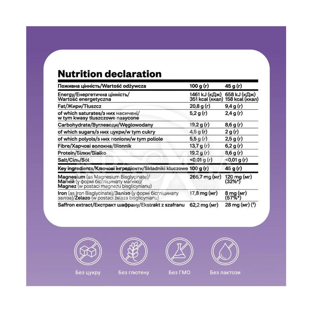 Магний (бисглицинат магния): поддерживает нормальную функцию нервной и мышечной системы, снижает усталость и способствует эмоциональному балансу.