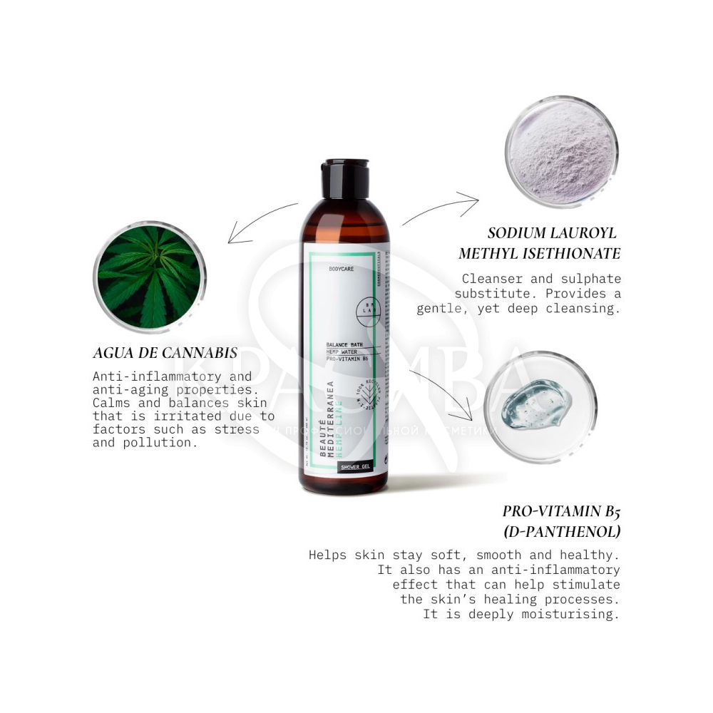 Описание: Гель для душа с мягкими поверхностно-активными веществами в сочетании с цветочной водой Cannabis Sativa (полученной из стеблей и листьев путем паровой дистилляции), кондиционером для кожи и провитамином B-5 для ежедневной очистки и ухода за кожей.