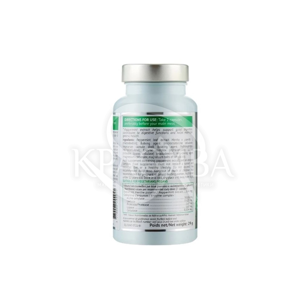 Состав: Состав (на 2 капсулы в сутки): экстракт листьев мяты перечной (Mentha x piperita L.) – 334 мг., альфа-амилаза – 30,06 мг., лактаза – 15,03 мг., протеаза – 1, 67 мг, липаза – 1,67 мг, целлюлаза – 0,334 мг.
