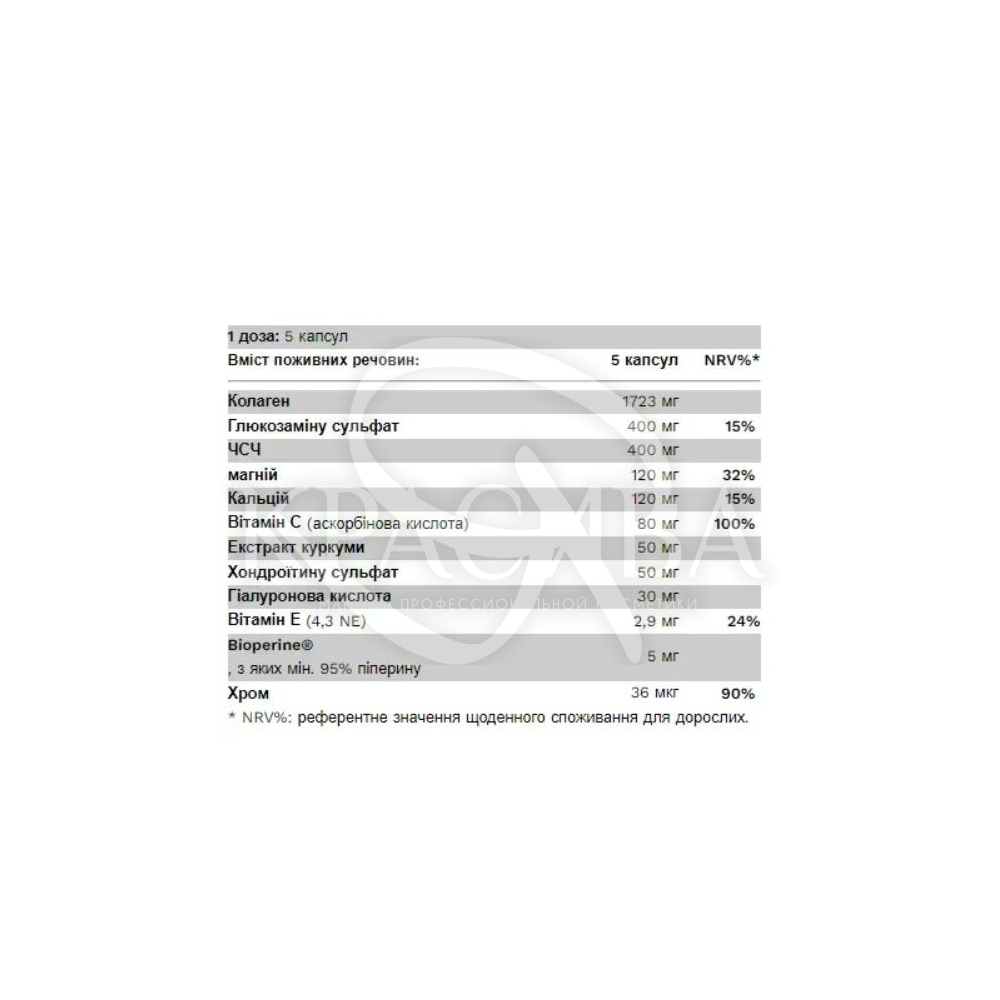 Для оптимизации жира в организме наша формула была обогащена Bioperine®, а также хромом, который способствует поддержанию нормального уровня сахара в крови. Рекомендуемая дозировка: принимать по 5 капсул в день во время еды. Упаковка: 125 капсул (25 порций) – 1 порция: 5 капсул Вес нетто: 96,1 г Ингредиенты: гидролизованный говяжий коллаген, пищевой желатин, глюкозамин сульфат, МСМ, оксид магния, карбонат кальция, аскорбиновая кислота, куркума5 1 экстракт , хондроитина сульфат, гиалуроновая кислота, краситель (диоксид титана), DL-альфа-токоферол ацетат, Bioperine® (экстракт Piper nigrum (güm. lcs) 50:1) [Bioperine® является зарегистрированной торговой маркой Sabins хрома.