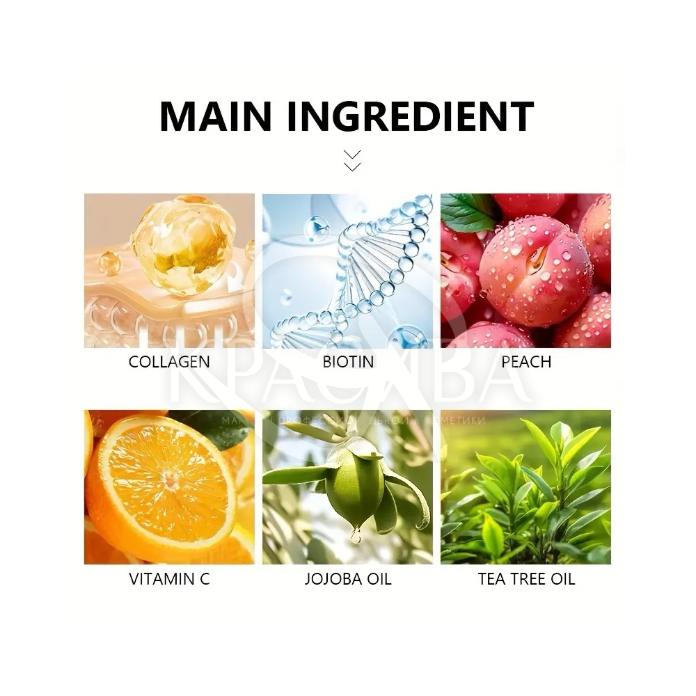 Активные ингредиенты: Collagen, Biotin, Peach, Vitamin C, Jojoba Oil, Tea Tree Oil.