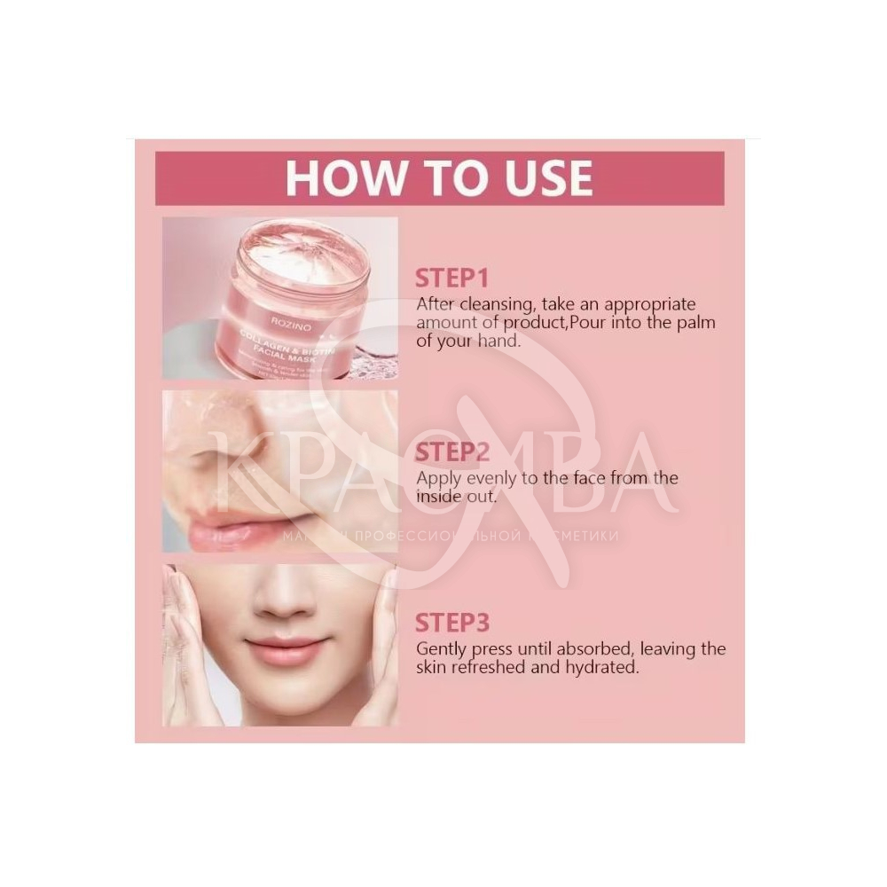 Описание: Коллагеновая биотиновая маска для лица на день и ночь с богатым содержанием коллагена, увлажняет и разглаживает, возвращает источник влажности и яркости светло-бежевому тону кожи.