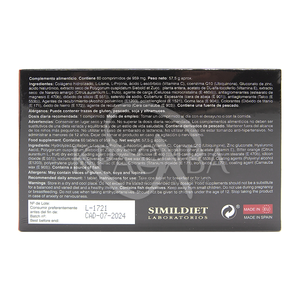 Состав: Состав (1 таблетка), мг (mg): Морской гидролизированный коллаген 500, L-лизин 75, L-пролин 75, Витамин C 64 80% ДН, Коэнзим Q 10 60, Цинк (глюконат цинка) 8 80% ДН, Гиалуроновая кислота 50, Экстракт горца японского (Polygonum cuspidatum Sieb. et Zucc.) 20 из них Ресвератрол 10, Витамин Е (DL альфа-токоферил ацетат)9,6 80%ДН, Экстракт горького апельсина (Citrus aurantium L.) 11, Селен (селенит натрия) 55 µg 100% ДН. Вспомогательные вещества: наполнитель (микрокристаллическая целлюлоза), агент против слеживания (стеарат магния, диоксид кремния). Покрытие (пчелиный воск, тальк, поливиниловый спирт, ПЭГ, шеллак, карнаубский воск, краситель (диоксид титана, оксид железа). Без ГМО. ДН – дневная норма.