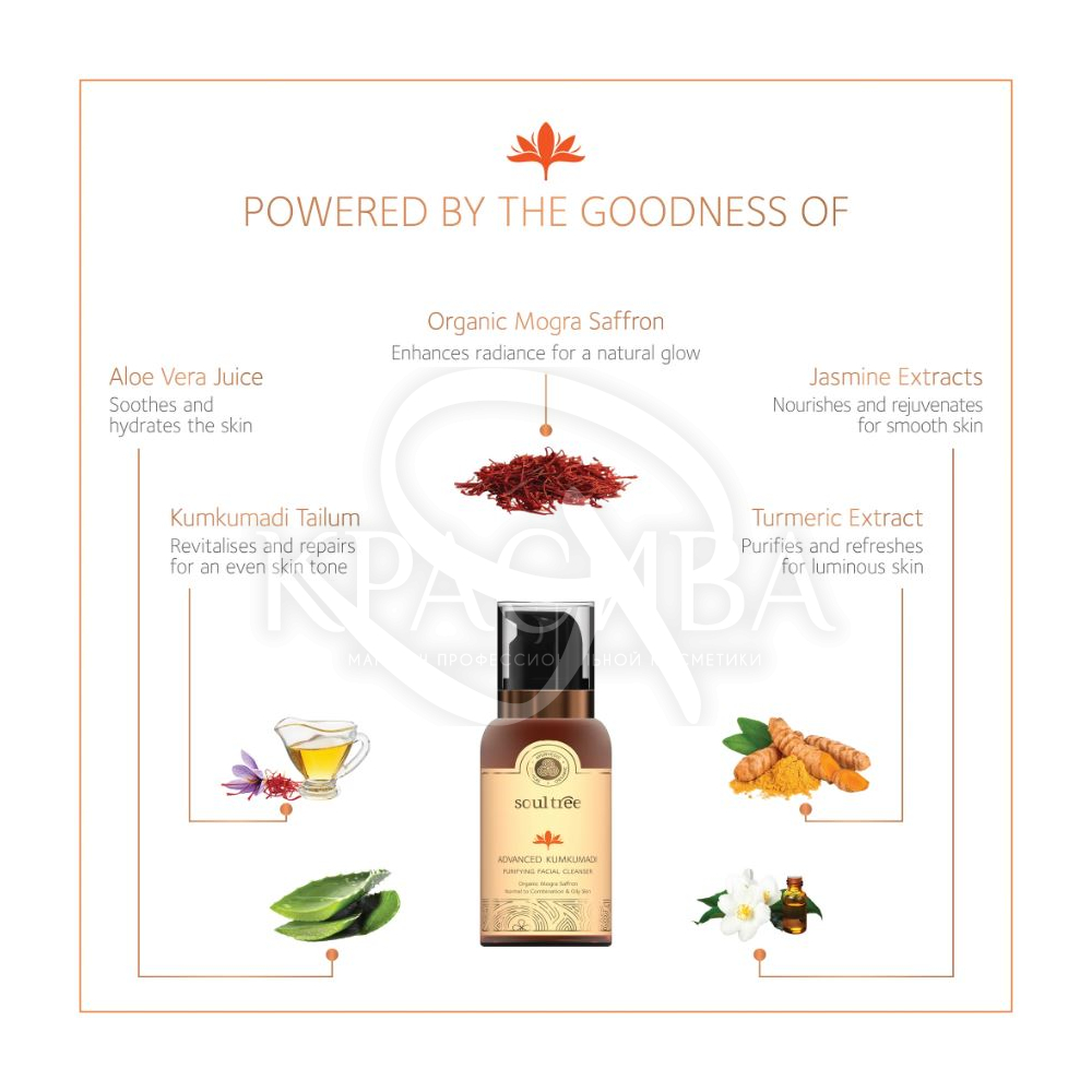 Описание: Очищающее средство Advanced Kumkumadi содержит самую чистую форму 100% органического шафрана Moga. Деликатно удаляет грязь, пыль и остатки макияжа, оставляя кожу чистой, сияющей и сбалансированной.