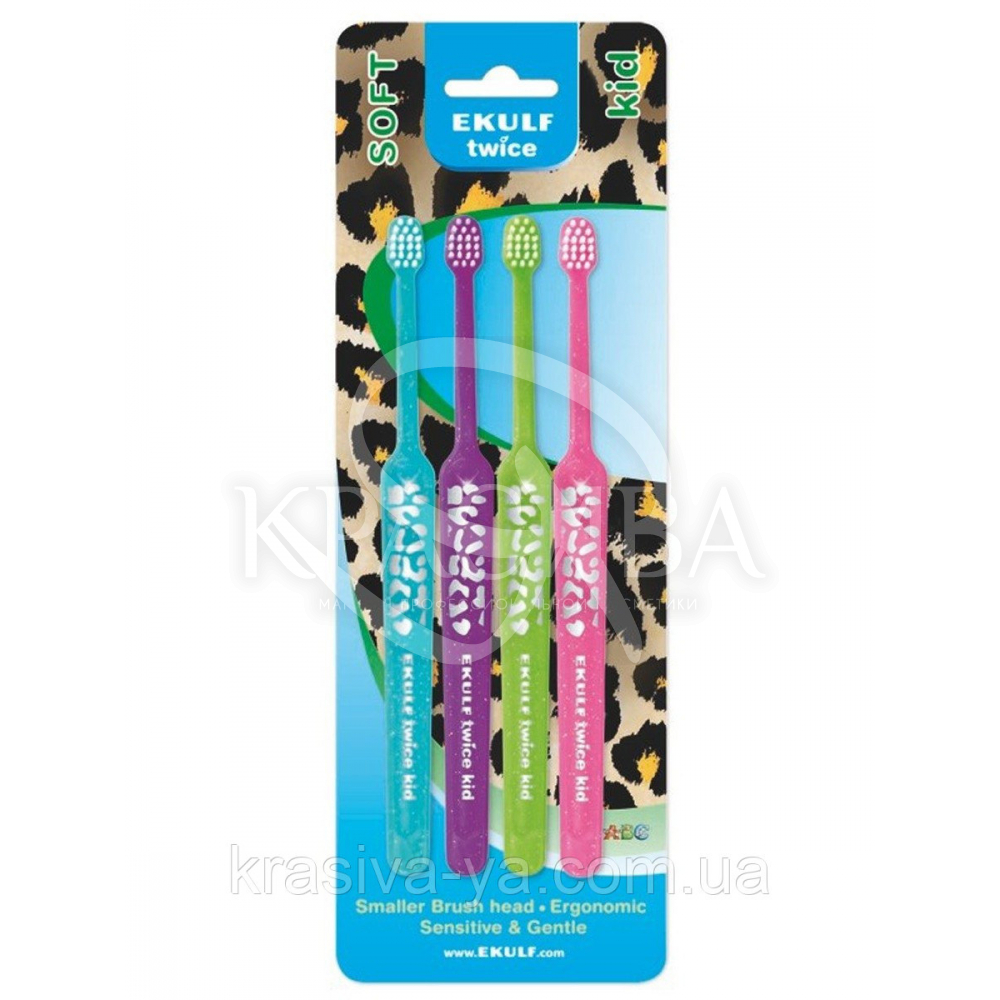 Описание набора: Набор зубных щеток мягких Ekulf Twice Kid от 3 до 6 лет - это зубные щетки, адаптированные к размеру полости рта, учитывая возрастные особенности. Щетка имеет компактную головку, что обеспечивает простой и легкий доступ ко всем поверхностям зуба, гарантируя тщательную очистку межзубных промежутков и придесневой области, а также позволяет избегать рвотных рефлексов, позволяя детям иметь положительный опыт использования зубной щетки, делая чистку зубов максимально комфортной и в тоже время эффективной. Длинная эргономичная ручка щетки, не скользит в руке и обеспечивает легкий доступ к наиболее отдаленным областям полости рта и позволяет одновременно держать зубную щетку как родителю, так и ребенку. Изогнутая гибкая шейка щетки повторяет форму зубной дуги не натягивая и не травмируя губы и щеки во время чистки. Мягкая щетина имеет закруглении на концах щетинки, которые мягко очищают зубной налет, не повреждая зубы и десны, обеспечивая эффективную и одновременно щадящую очистку.
