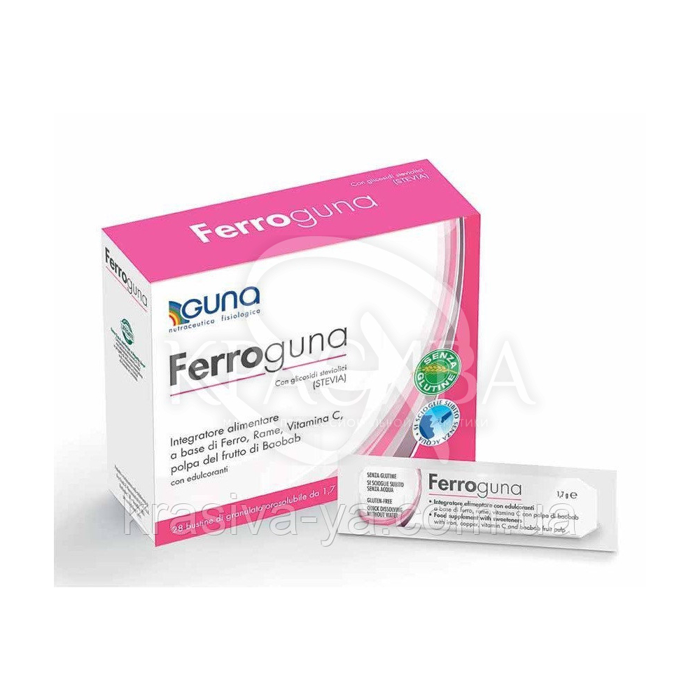Ferro GUNA обеспечивает 100% рекомендуемой суточной дозы железа, это очень высокая степень абсорбции, потому что это оно перено¬сится в виде органического комплекса (железа фумарат) в роторастворимой форме, немедлен¬но биодоступно для организма. 14 мг фумарата, железа, содержащееся в 1 саше, обеспечивает 5 мг ионов железа, которые доступны для поглощения и покрывает среднюю суточную потребность железа. Биодоступность железа улучшается благодаря наличию витамина С, меди и мякоти фруктов Баобаба, они не только улучшают всасывание железа, но в то же время поставляют для организма элементы с антиок-сидантными и защитными свойствами. Ferro GUNA растворяется непосредственно в рту без воды и быстро впитывается. Благодаря высокой биодоступности Ferro GUNA не вызыва¬ет побочного действия на желудочно-кишечный тракт.