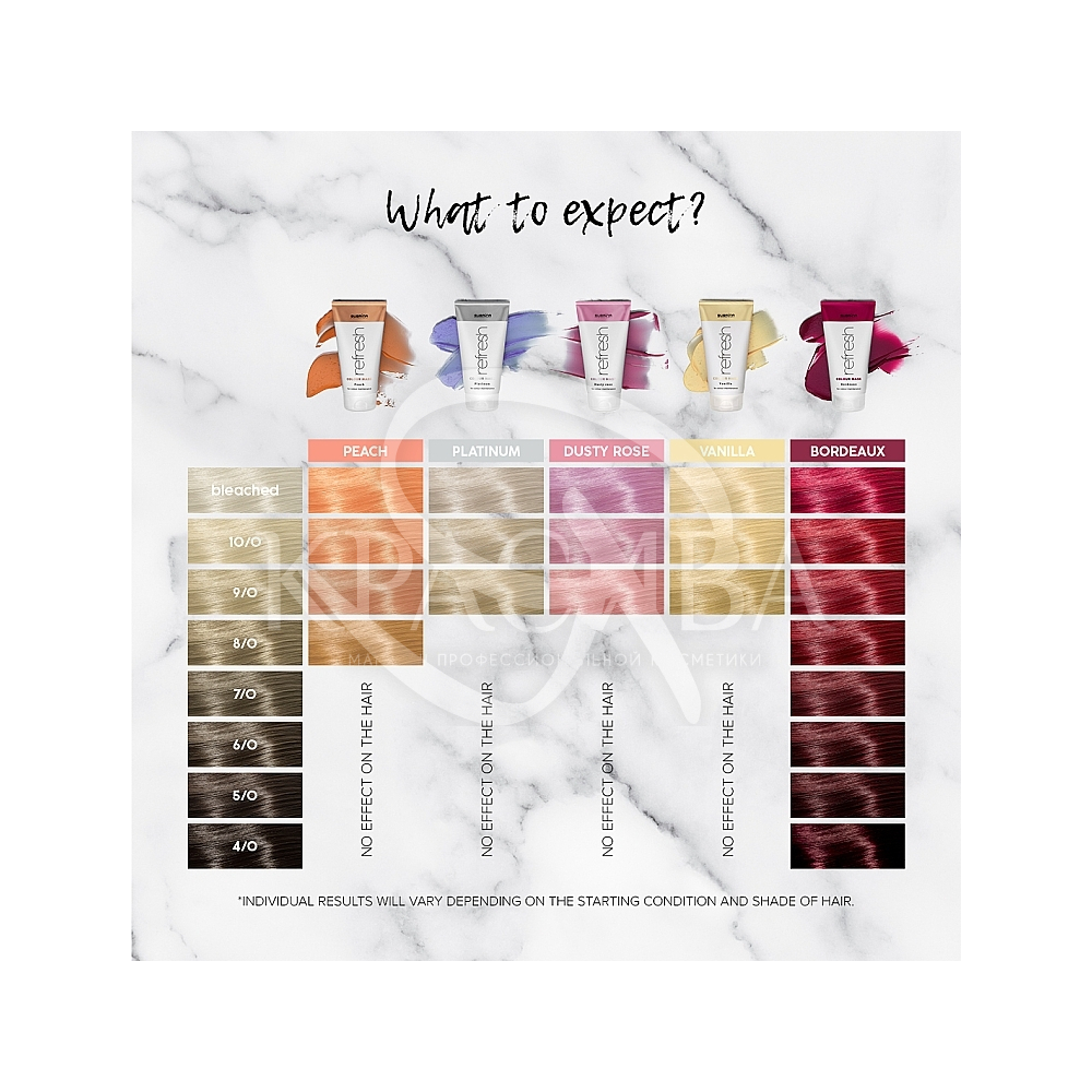 Способ применения: Нанесите маску на влажные волосы, выдержите от 2 до 5 мин. Для более выраженного цвета можно увеличить время выдержки. Тщательно смойте водой.