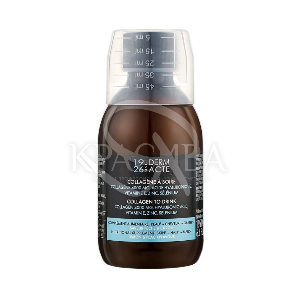 Состав: Water, hydrolyzed marine collagen (fish) (not of French origin), fructose, citric acid, peach flavor (1.1%), lemon flavor (0.4%), preservatives, potassium sorbate, sodium benzoate, hyaluronic acid, zinc sulfate, vitamin E, yeast with selenium, sweetener: sucralose.