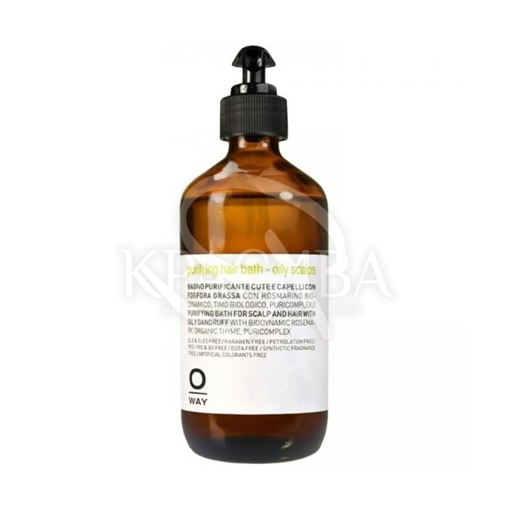 Эффект шампуня Oway Purifying Oily Scalps для жирных волос и против устранения перхоти основан на воздействии растительных экстрактов на биохимию кожи головы. Тик, махагон (красное дерево), лопух и розмарин благодаря значительной концентрации танинов прекрасно очищают всю кожу и волосы, губительно действуют на бактерии и вирусы, тонизируют клетки, стимулируют внутриклеточный обмен веществ, проявляют антибактериальное и противовоспалительное действие. Тимьян нормализует метаболизм, регулирует количество воды, устраняет шелушение и покраснения, эффективно борется с перхотью, предупреждая ее дальнейшее появление. Комплекс Phycosaccaride ACG, источником которого служит ламинария, уменьшает выделение себума, подавляет жизнедеятельность патогенных организмов которые вызывают появление перхоти и усиливает регенерацию, оздоравливая кожный покров.
