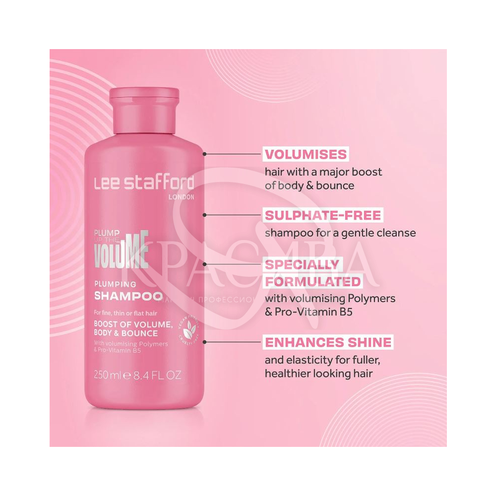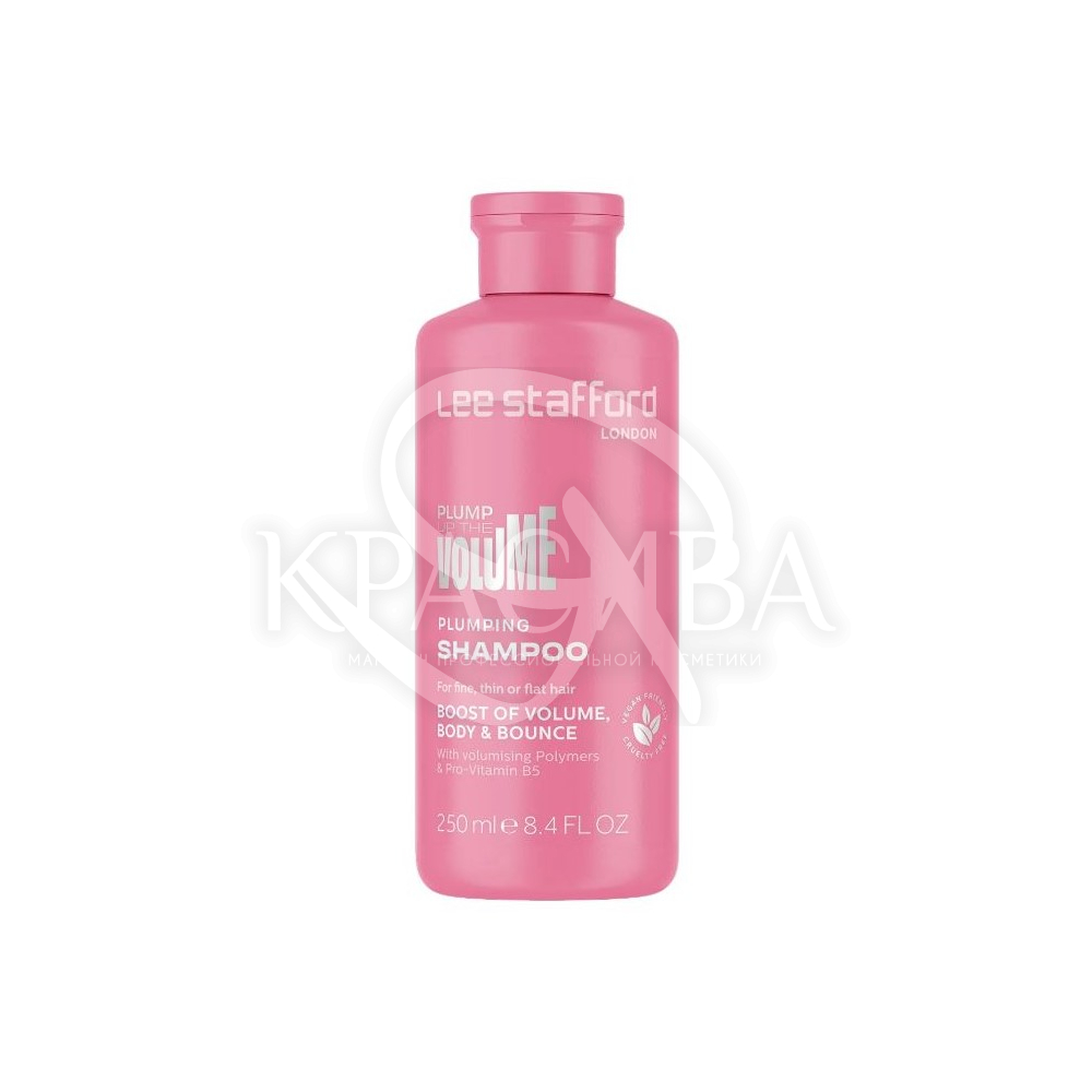 Описание: Созданный для придания значительного объема, шампунь Lee Stafford не содержит сульфатов, поэтому мягко и бережно очищает волосы от остатков продуктов и масел, делая пряди свежими, эластичными, объемными и упругими. Полимеры, входящие в состав, придают роскошный блеск, дополнительный объем и плотность тонким и нормальным волосам. Провитамин B5 глубоко питает волосы по всей длине, делает их сильными и красивыми.