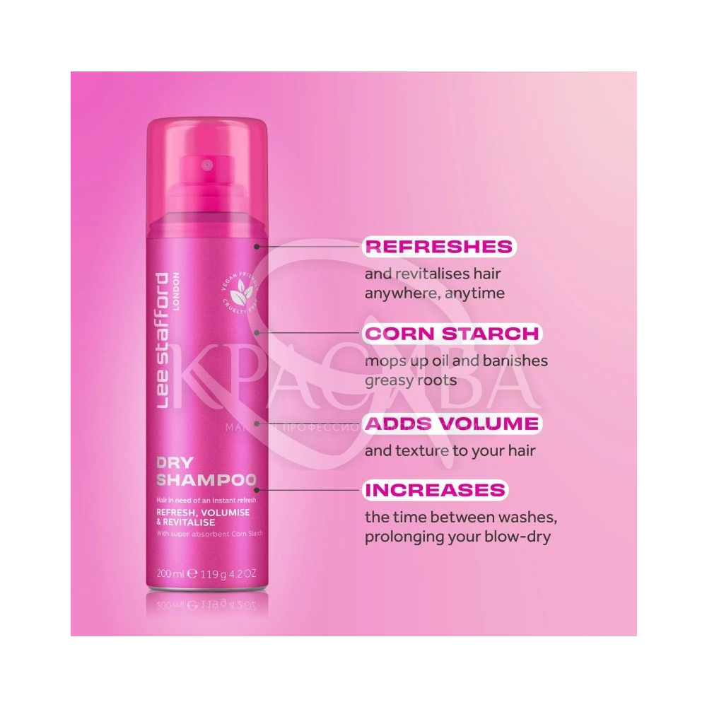 Описание: Шампунь для волос Lee Stafford Dry Shampoo - это быстрый и простой в использовании спрей, освежающий и оживляющий ваши волосы, где бы вы ни находились! Теперь вам не придется беспокоиться о том, что вы пропустите день мытья волос.
