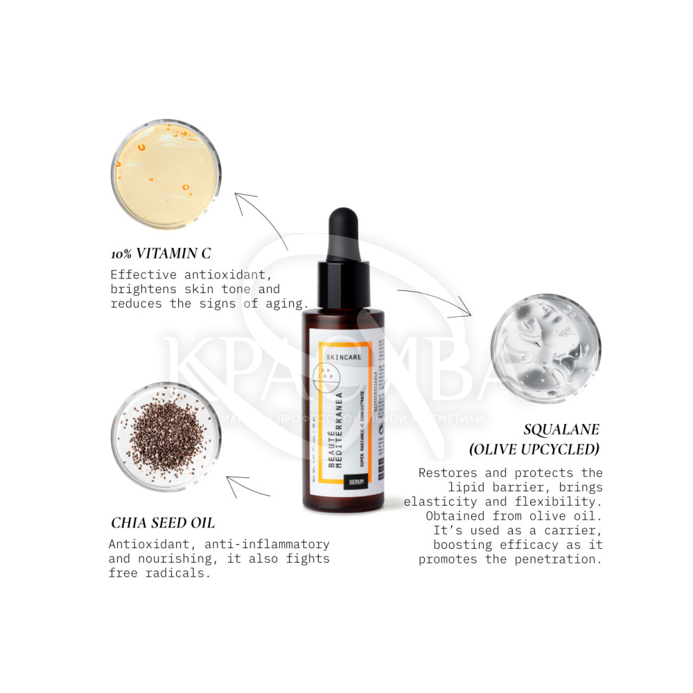 Описание: Откройте секрет сияющей кожи. Наш концентрат Super Radiance-C с концентрацией 10% витамина С в сочетании с маслом чиа и скваланом придает сияние даже тусклой коже. Это мощное омолаживающее масло для лица с антиоксидантным эффектом, которое улучшает внешний вид на глобальном уровне: увлажнение, мягкость, эластичность, жизненную силу, защиту и выравнивание тона. Кроме того, средство предотвращает старение кожи и является идеальным союзником против пигментных пятен и ультрафиолетовых лучей. Сухое, легкое быстро впитывающееся масло.