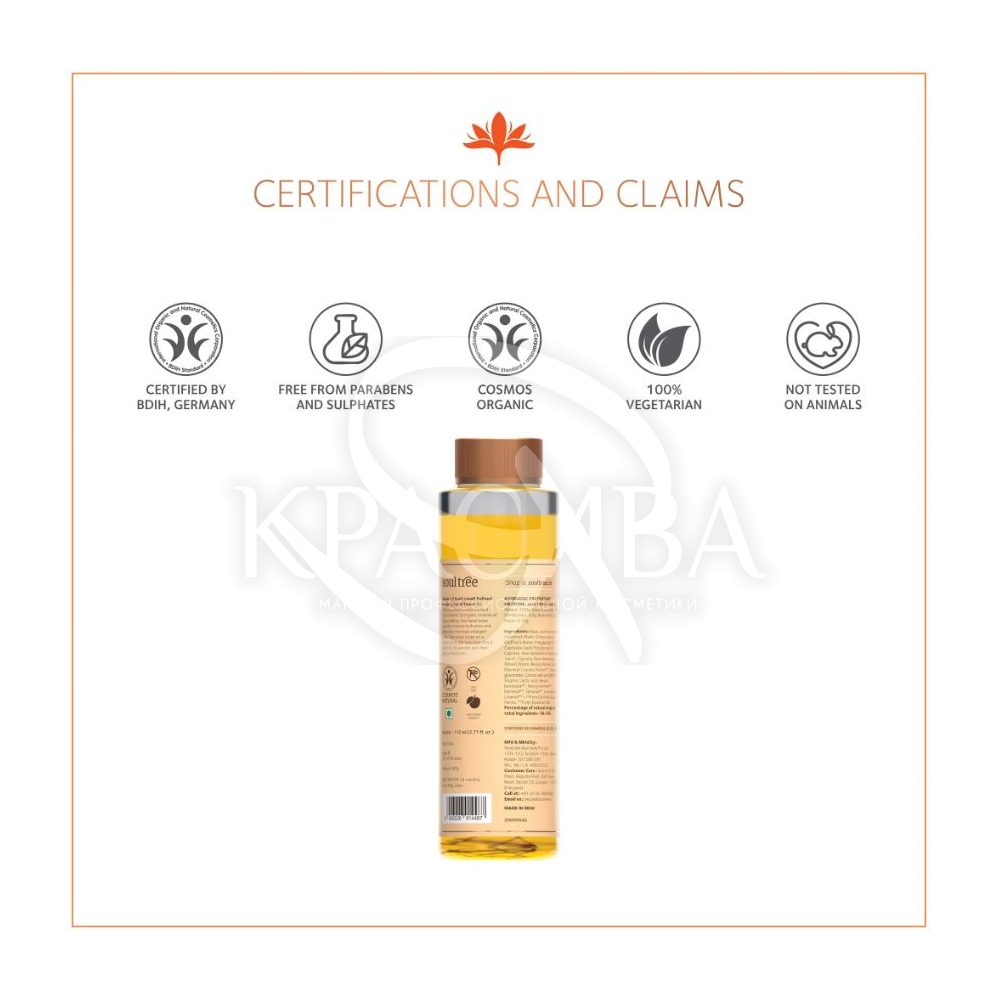Состав: Aqua (вода), Capryl/Caprylyl Glucoside (каприл/каприлилглюкозид), Disodium Cocoyl Glutamate (динатрий кокоилглутамат), Glycerin (глицерин), Sodium Lactate (and) Sodium Gluconate (лактат натрия и глюконат натрия), алоэ вера), Jasminum Officinale (Jasmine) Water (жасминовая вода), Coco Glucoside & Glyceryl Oleate (коко-глюкозид и глицерил олеат), Benzyl Alcohol (and) Glyceryl Laurate (бензиловый спирт и глицерил лаурат), X (парфюм/аромат), Glyceryl Oleate (глицерил олеат), Citric Acid (лимонная кислота), Kunkumadi Oil (масло кункумади), Curcuma longa (Turmeric) Extract (экстракт куркумы), Sodium Gluconate (глюконат натрия), Benzoate (бензил бензоат), Benzyl Acetate (бензил ацетат), Farnesol (фарнезол), Geraniol (гераниол), Limonene (лимонен), Linalool (линалоол).