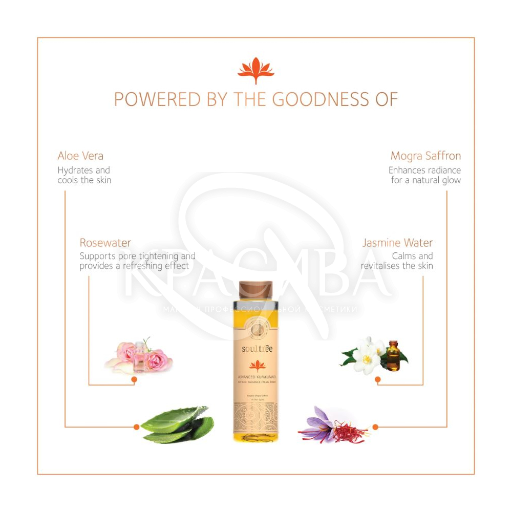 Описание: Тонер Advanced Kumkumadi имеет ультрароскошную формулу, обогащенную 100% органическим шафраном Mogra, алоэ вера, розовой водой и водой жасмина. Он тонизирует, увлажняет и освежает кожу, успокаивает красноту, помогает сузить поры и уменьшить морщины.