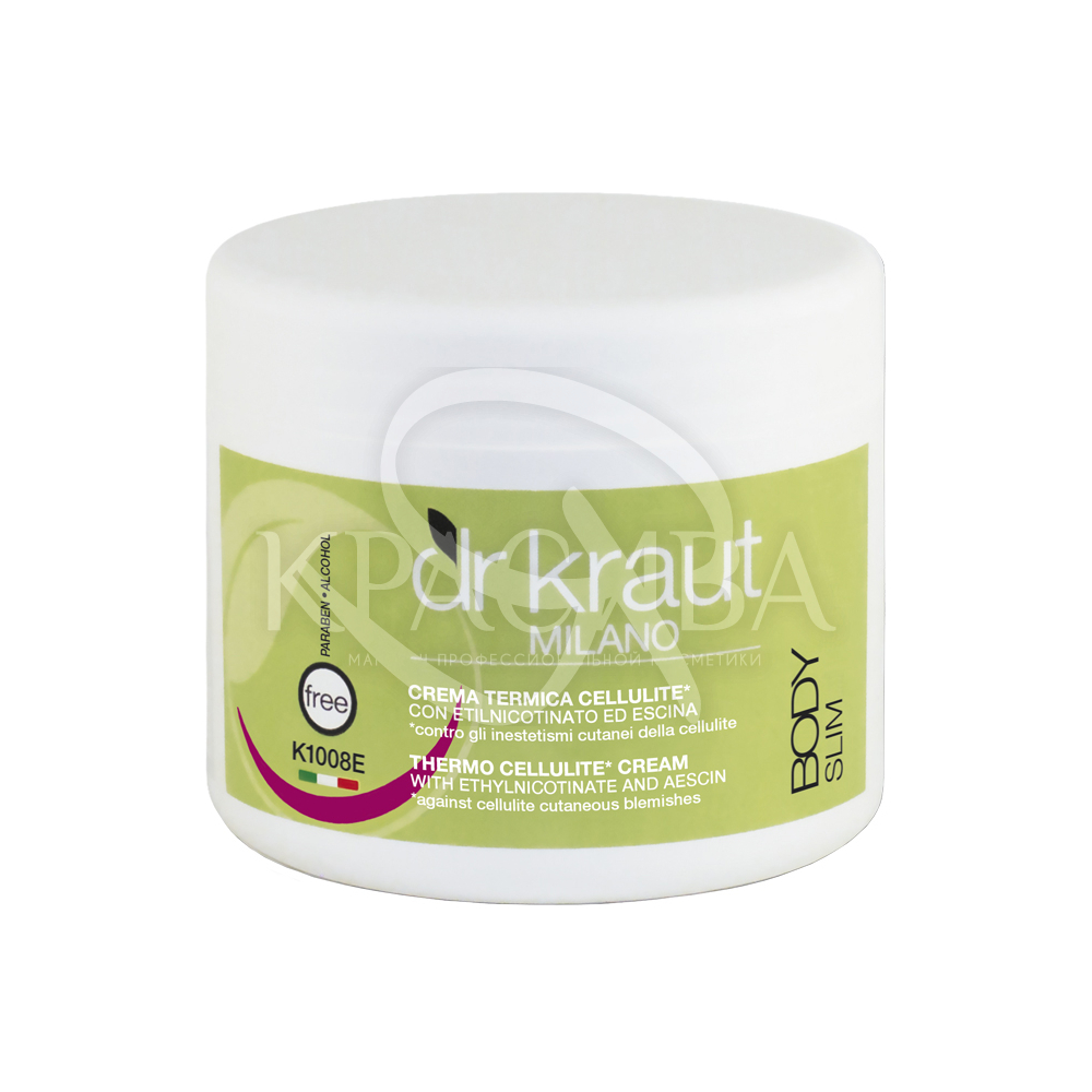 Опис: Ультрапроникний антицелюлітний термо-крем Dr. Kraut створений для зменшення жирових накопичень і лікування недоліків, пов'язаних з целюлітом. Етилнікотинат розігріває шкіру залежно від типу шкіри та температури навколишнього середовища. Сприяє розщепленню локальних жирових відкладень та підвищенню пружності шкіри.