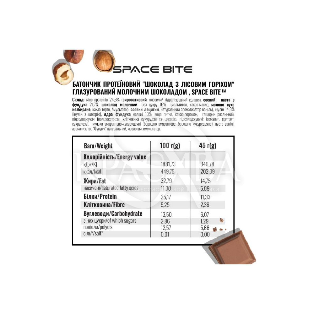 Склад: Мікс протеїнів 23% (сироваточний, гідролізованийколлаген, казеїновий, соєвий), борошнофундучне, шоколад молочний (цукрозамінник(мальтітол), молоко сухе незбиране, какао масло, какао терте, соєвий лецитин, ароматизатор ванілі натуральний), клітковина тапіоки, паста фундучна, вода питна, какао порошок, какао масло, цукрозамінник0,3% (розчинна клітковина рослинного походження, клітковина кукурудзи та цикорію, підсолоджувачі: ізомальт, ерітріт, цукралоза), натуральний екстракт ванілі, гліцерин рослинний, кульки амарантові (борошно амарантове і кукурудзяне). Може містити сліди глютену, інших горіхів, арахісу.