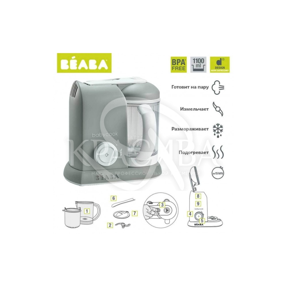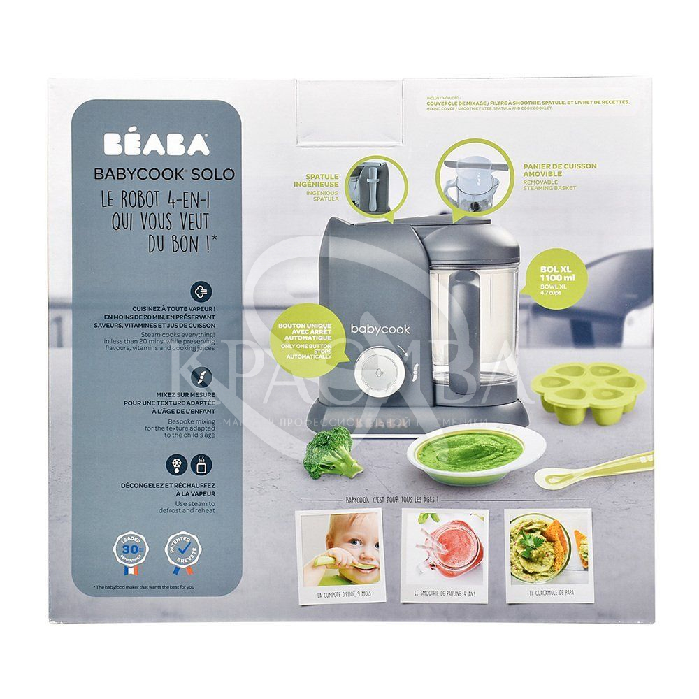 Опис: Компанія Beaba є Європейським експертом в дитячій гастрономії. Більше 25 років молоді матусі починають перший прикорм за допомогою блендера-пароварки Babycook і аксесуарів Beaba. Блендер-пароварка Babycook 4 в 1: готує на пару, зберігаючи вітаміни і натуральний смак подрібнює, можливість вибору консистенції залежно від віку дитини підігріває розморожує