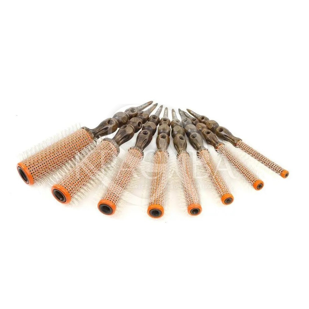Опис: Цей брашинг має спеціально розроблений барабан із щетинками, виготовлений у два шари. Внутрішній шар з дерева грає роль термоізоляційного матеріалу, тоді як зовнішній шар – циліндричний елемент із медичного алюмінію – досягає температури, схожої на потік повітря фена. Це дозволяє брашингу набувати властивостей плойки, забезпечуючи ідеально пряме витягнуте волосся або чіткі локони. Алюмінієвий циліндр має турмалінове покриття, що забезпечує іонізуючий антистатичний ефект. Щетина виготовлена з термостійкого нейлону та мікрочастинок срібла, має антибактеріальні властивості та нейтралізує неприємні запахи. Нейлонова щетина стійка до високих температур, що дозволяє використовувати брашинг із будь-яким феном.
