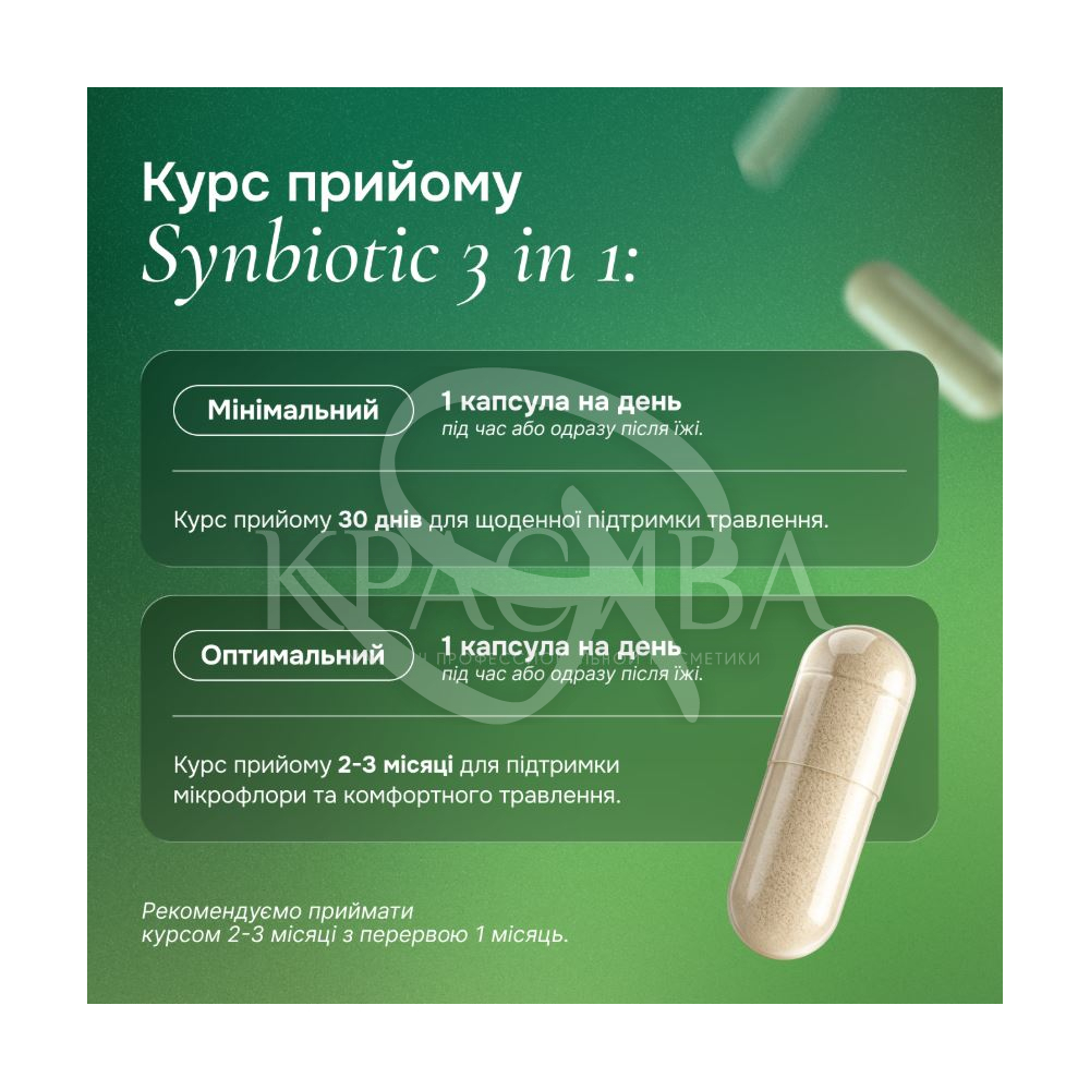 Час прийому: під час або відразу після основного прийому їжі. Для оптимального результату приймайте капсулу, запиваючи достатньою кількістю води.