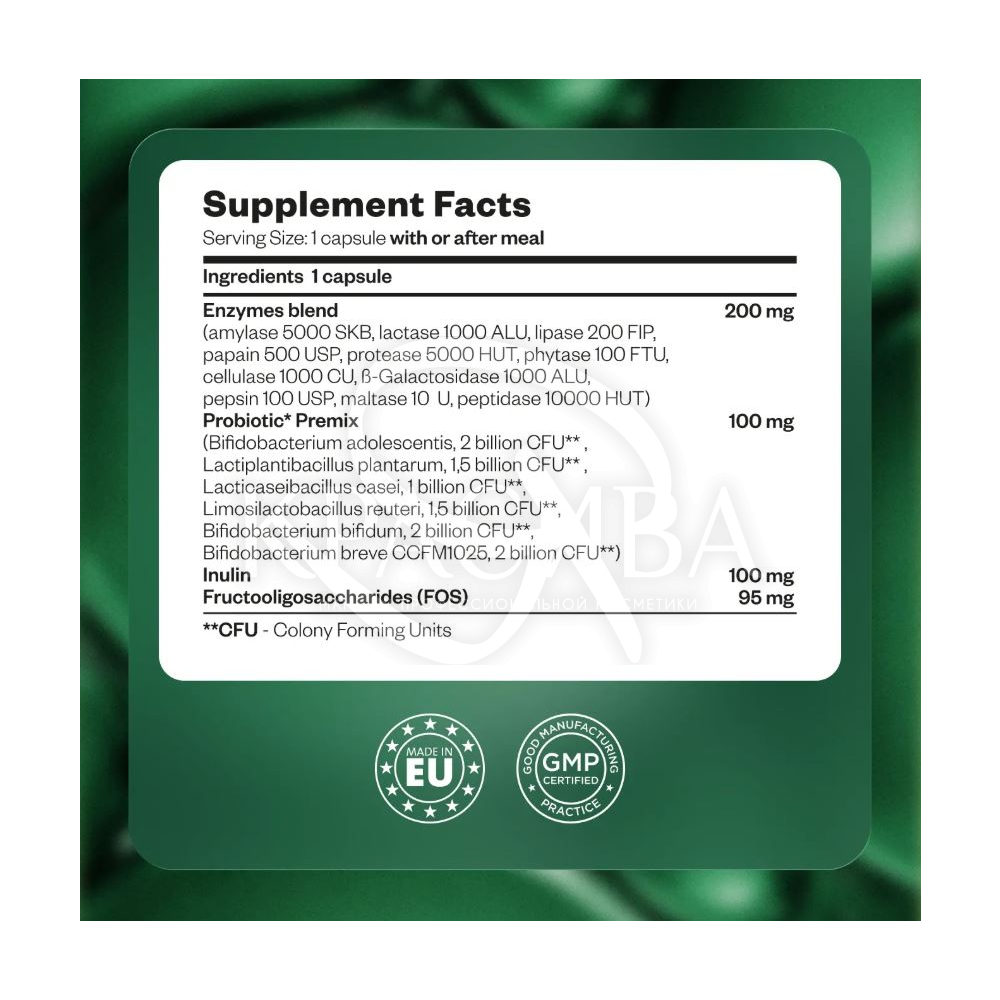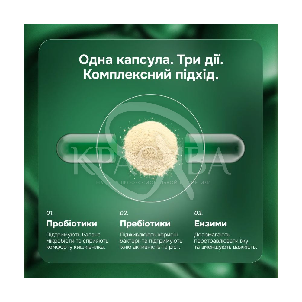 Особливості: зменшує відчуття тяжкості та здуття після їжі; допомагає полегшити засвоєння поживних речовин із їжі; опосередковано підтримує імунну систему через баланс мікрофлори; підходить людям старше 18 років; корисна при змінах раціону, подорожах, а також при стресі або після прийому антибіотиків; впливає на якість шкіри через покращення внутрішнього балансу та підтримки здоров'я мікрофлори кишечника; створена без надмірних дозувань, з акцентом на м'яку дію; підходить для дорослих з різною дієтою та способом життя, включаючи тих, хто часто вживає білкову або важку їжу.