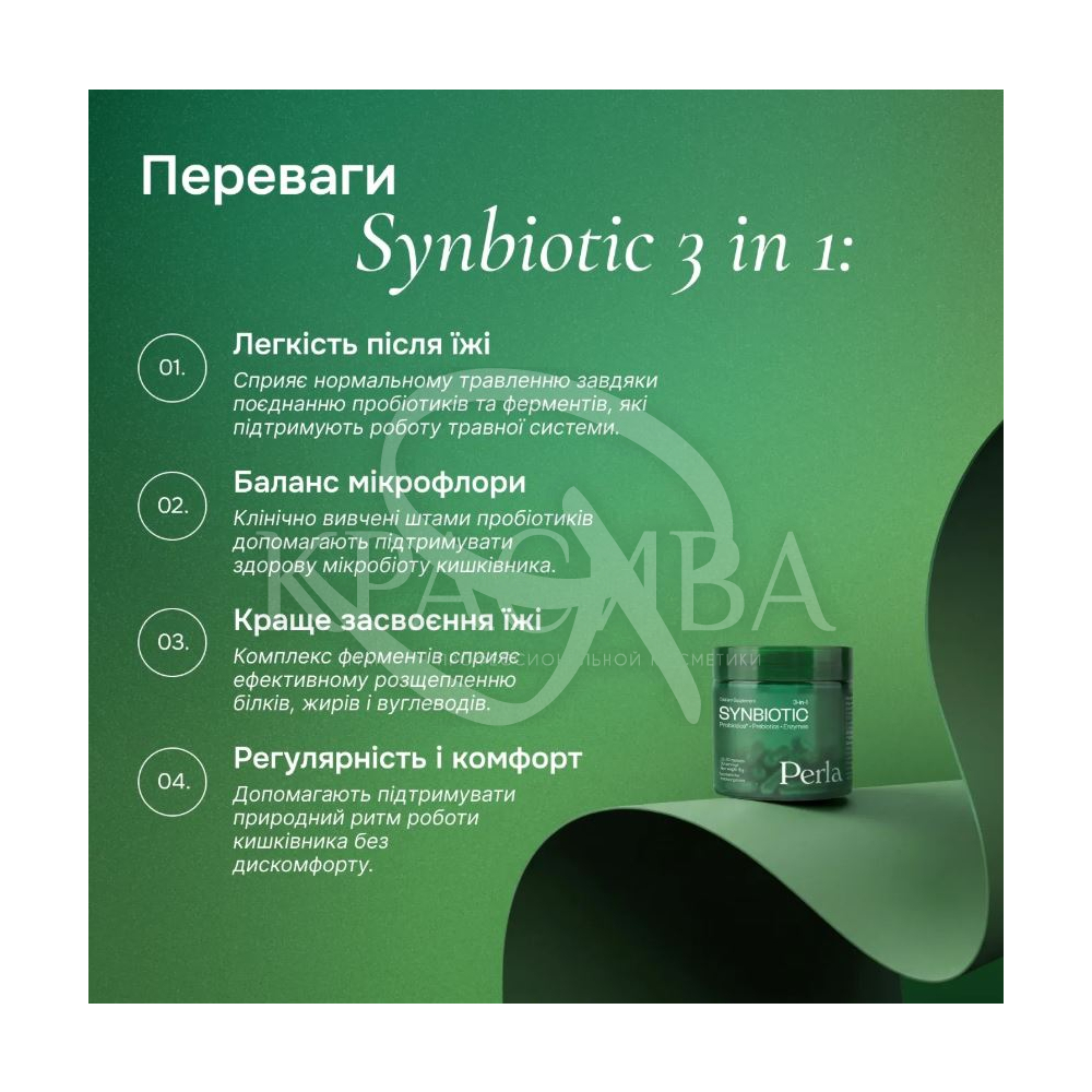 Опис: Добавка для підтримки травлення Perla Helsa Synbiotic 3-in-1 – комплекс нутрицевтичної дії, створений для підтримки травної системи та внутрішнього балансу організму. Формула поєднує пробіотики, пребіотики та ензими, які працюють у синергії для оптимізації процесів травлення та підтримки мікробіоти кишечника. Їхня дія спрямована на покращення перетравлення їжі, зниження почуття тяжкості та дискомфорту після прийому їжі, а також сприяння регулярності роботи кишечника. Завдяки відкладеному вивільненню активи досягають того сегмента травного тракту, де їхня дія найефективніша. Це забезпечує цілеспрямоване впливом геть фізіологічні механізми, підтримуючи комфорт і легкість без надмірної стимуляції.