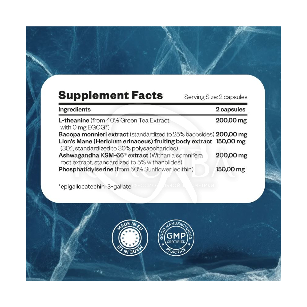 Склад: L-теанін з екстракту зеленого чаю (Camellia sinensis L.), екстракт Ашваганди KSM-66 (Withania somnifera), екстракт Бакопи Моньєрі (Bacopa monnieri), екстракт гриба Грива лева (Hericium erinaceus), фосфатидилратин annuus агент).