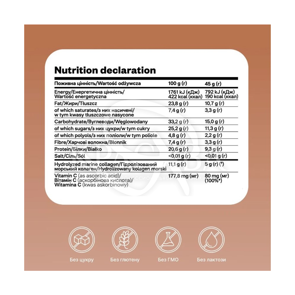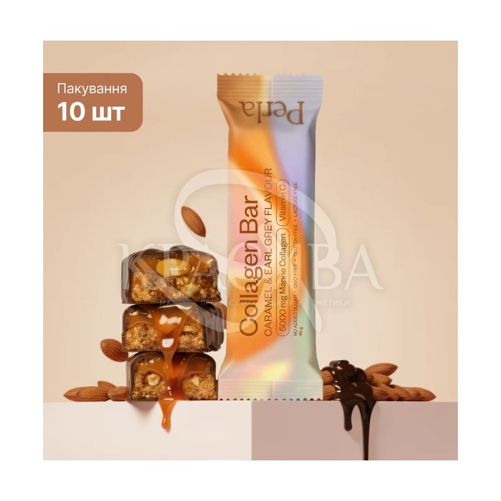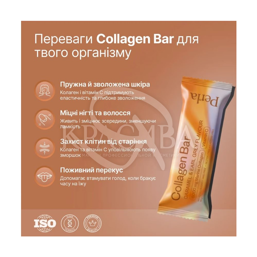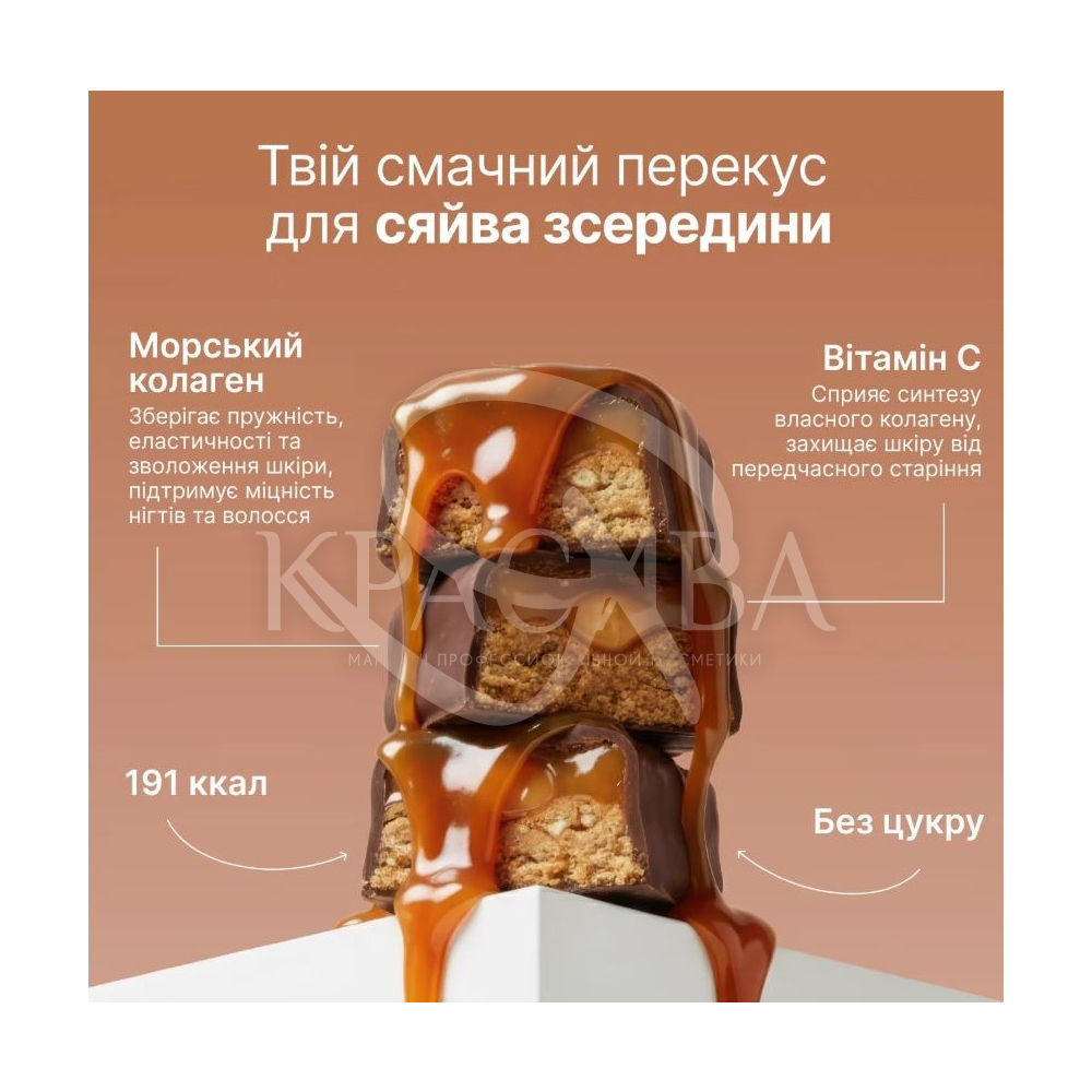 Опис: Collagen Bar – смачний та корисний батончик з мигдалем, смаком карамелі та чаю Earl Grey. Продукт створений для підтримки краси та молодості зсередини, зміцнення волосся та нігтів, а також для підтримки пружності та еластичності шкіри.