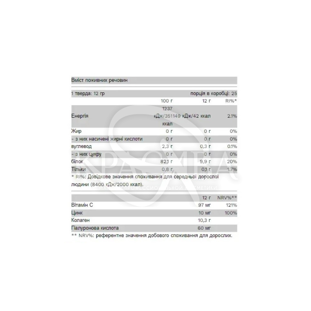 Склад: гідролізований яловичий колаген, регулятор кислотності (лимонна кислота), гідролізований колаген морської риби, аромат, барвник, підсолоджувачі (ацесульфам-К, сукралоза), аскорбінова кислота, кухонна сіль, гіалуронова кислота, оксид цинку.