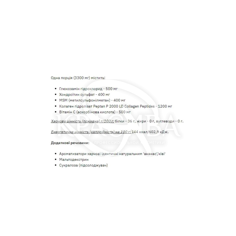 Компоненти, що входять до складу даного препарату, посилюють дію один одного, тим самим дозволяючи досягти найпотужнішого ефекту та всебічного захисту суглобів та зв'язок. Колаген становить основу сполучної тканини в організмі, робить її еластичною. Метилсульфонилметан полегшує запальні процеси, покращує проникність стінок клітин (краще виводиться молочна кислота), зменшує відчуття втоми у процесі тренування. Глюкозамін з хондроїтином підтримує належну кількість міжхрящової рідини та відновлює хрящову тканину. Вітамін C нормалізує обмінні процеси та нейтралізує вплив вільних радикалів.