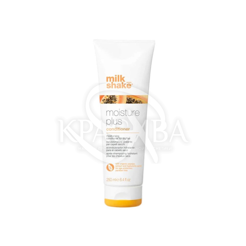 Надає м'якості та слухняності сухому волоссю, підтримуючи оптимальний баланс вологи. Це також робить волосся помітно молодшим. Milk_shake moisture plus надає м'якості та слухняності сухому волоссю, підтримуючи оптимальний баланс вологи. Збагаченою гіалуроновою кислотою, суперзволожуючим інгредієнтом, він збалансує рівень зволоження волосся. Антиоксидантні властивості органічного екстракту папайї посилюють молодість і сяйво, зменшуючи вироблення вільних радикалів.