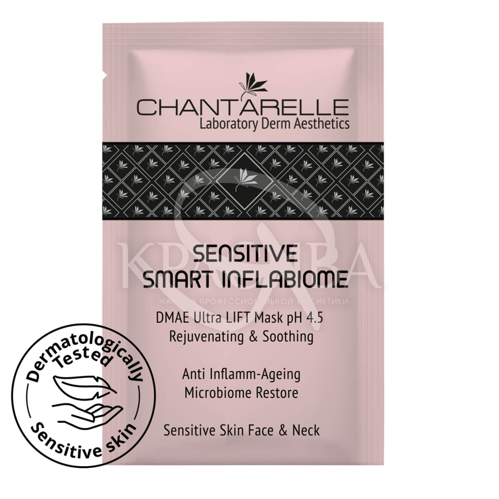 Опис: Маска ультра-ліфтинг з ДМАЕ pH 4,5, що омолоджує та заспокійлива, проти запального старіння, що регенерує мікробіом, для обличчя та шиї чутливої шкіри.