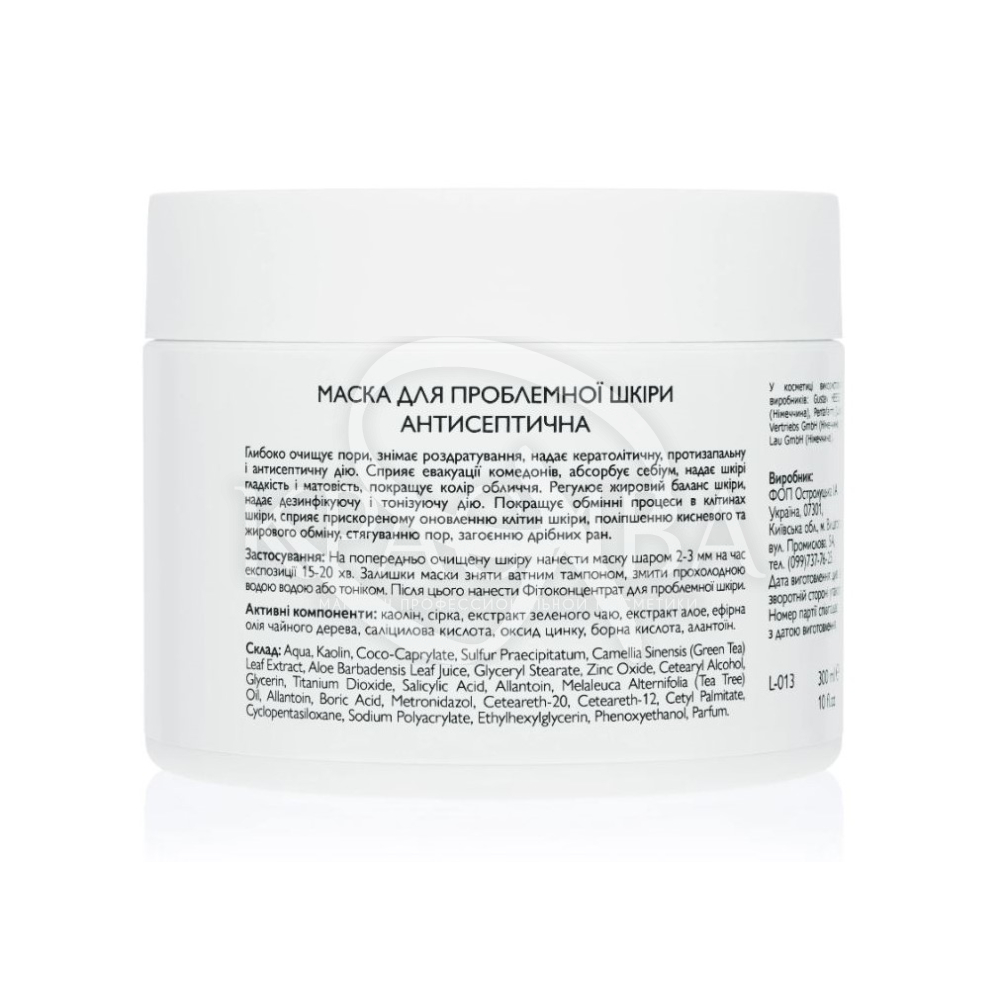 Опис: Кремоподібна маска глибоко очищає пори, знімає подразнення, кератолічну, протизапальну та антисептичну дію. Сприяє евакуації комедонів, адсорбує себіум, надає шкірі гладкості та матовості, покращує колір обличчя. Регулює жировий баланс шкіри, надає на шкіру дезінфікуючу та тонізуючу дію. Покращує обмінні процеси в клітинах шкіри, сприяє прискореному оновленню клітин шкіри, поліпшенню кисневого та жирового обміну, стягуванню пір, загоєнню дрібних ран.