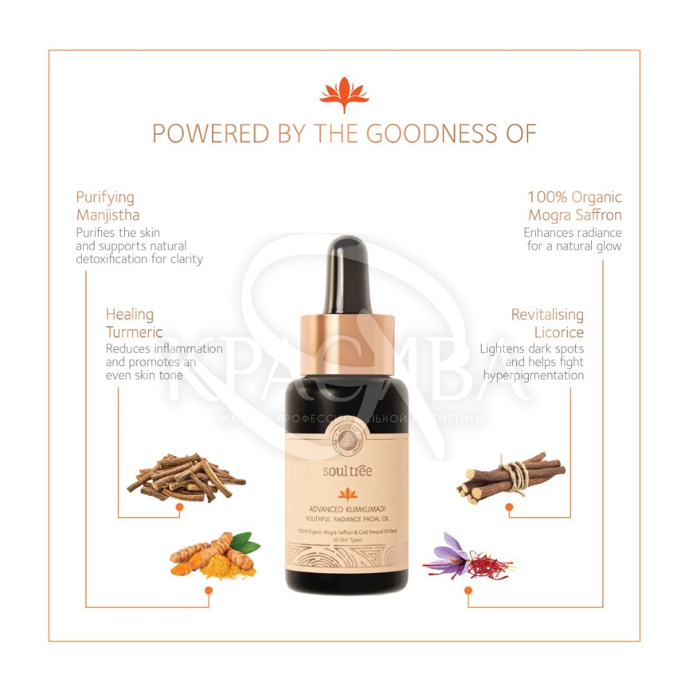Опис: Олія для обличчя з шафраном і куркумою містить 100% органічний шафран Mogra та активні рослинні компоненти, що відновлюють природне сяйво й забезпечують глибоке зволоження. Формула живить тьмяну шкіру, допомагає зменшити гіперпігментацію та перші ознаки старіння, залишаючи обличчя м’яким і сяйливим. Підходить для всіх типів шкіри.