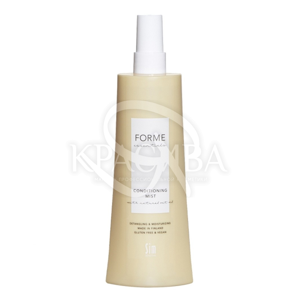 Forme Conditioning Mist не тільки зволожує волосся, а й відновлює структуру волосся, розгладжує його поверхню. Цей незмивний кондиціонер-спрей підходить для додаткового зволоження сухого волосся. Без глютену та компонентів тваринного походження, він містить олію насіння вівса, виготовлену у Фінляндії за високими скандинавськими стандартами якості та чистоти. Продукт також оснащений УФ-фільтрами, що забезпечують захист волосся від вицвітання.