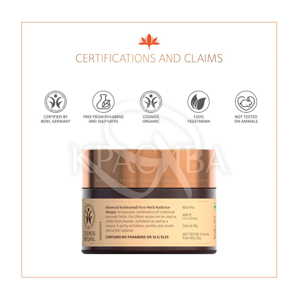 Склад: Вода (Aqua), каолін (Kaolin), сік алое барбаденсис (алое вера) (Aloe Barbadensis (Aloe Vera) Juice), гліцерин (Glycerin), олія кумкумаді (Kunkumadi Oil), полігліцерил-2 стеарат (і) гліцерил стеарат (і) стеариловий спирт (Polyglyceryl-2 Stearate (and) Glyceryl Stearate (and) Stearyl Alcohol), парфум/ароматизатор (Parfum), стеаринова кислота (Stearic Acid), коко-каприлат/каприт (Coco-Caprylate/Caprate), порошок шкірки лимона (Citrus Limon (Lemon) Peel Powder), порошок куркуми (Curcuma longa (Turmeric) Powder), бензиловий спирт (Benzyl Alcohol) (і) гліцерил лаурат (Glyceryl Laurate), масло какао (насіння какао) (Theobroma (Cacao) Cocoa Seed Butter), ізоаміл лаурат (Isoamyl Laurate), цетиловий спирт (Cetyl Alcohol), натрій цитрат (Sodium Citrate), магній-алюмінієвий силікат (Magnesium Aluminium Silicate), борошно нуту (турецького гороху) (Cicer arietinum (Chickpea) Flour), порошок німу (Azadirachta indica (Neem) Powder), порошок лодхри (Symplocos racemosa (Lodhra) Powder), порошок хемідесмуса індійського (анантмул) (Hemidesmus indicus (Anantmool) Powder), порошок пелюсток троянди столистої (Rosa centifolia (Rose) Petal Powder), токоферол (вітамін E) (Tocopherol), ксантанова камедь (Xanthan Gum), натрій глюконат (Sodium Gluconate), бензил бензоат, бензил ацетат, фарнезол, гераніол, лімонен, ліналоол.