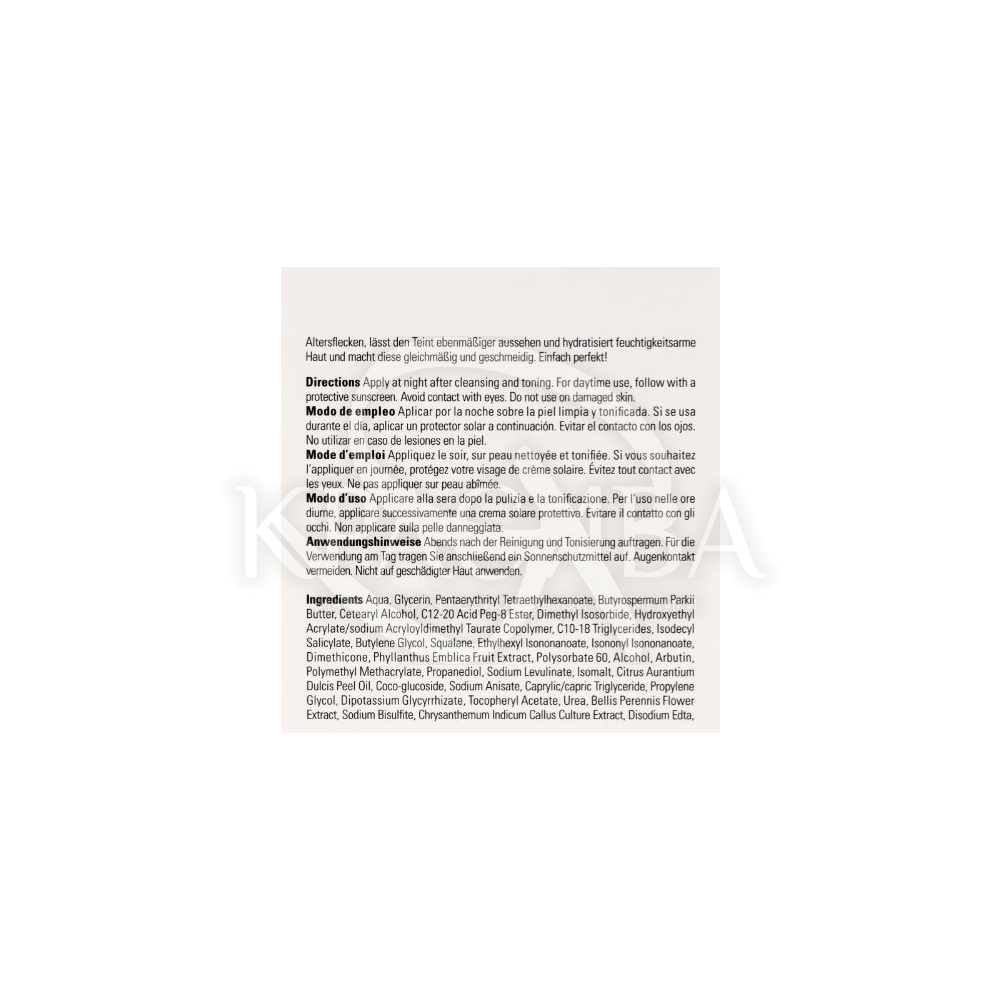 Склад: Water (Aqua/Eau), Glycerin, Pentaerythrityl Tetraethylhexanoate, Cetearyl Alcohol, Butyrospermum Parkii (Shea) Butter, Dimethyl Isosorbide, C12-20 Acid PEG-8 Ester, Isodecyl Salicylate, C10-Cy0 Copolymer, Isononyl Isononanoate, Butylene Glycol, Squalane, Phyllanthus Emblica Fruit Extract, Dimethicone, Chrysanthemum Indicum (Chrysanthemum) Biloba Leaf Extract, Camellia Sinensis Leaf Extract, Vitis Vinifera (Grape) Fruit Cell Extract, Chamomilla Recutita (Matricaria) Flower Extract, Viscum Album (Mistletoe) Hops) Extract, Achillea Millefolium Extract, Rh-Polypeptide-7, Acetyl Heptapeptide-9, Colloidal Gold, Tocopheryl Acetate, Dipotassium Glycyrrhi , Hydrolzyed Pea Protein, Arbutin, Phytosterols, Oligopeptide-4, Oligopeptide-5, Ethylhexyl Isononanoate, Diacetyl Boldine, Allantoin, Ceramide 3, Caprylic/Capric Triglyceride, Caporіcl Levulinate, Sodium Anisate, Polymethyl Methacrylate, Sodium Bisulfite, 1,2-Hexanediol, Alcohol, Lecithin, Urea, Sodium Phosphate, Isomalt, Xanthan Gum, Sodium Chloride, Olea Europaea (Olive) Fruit Oil, Phenox .