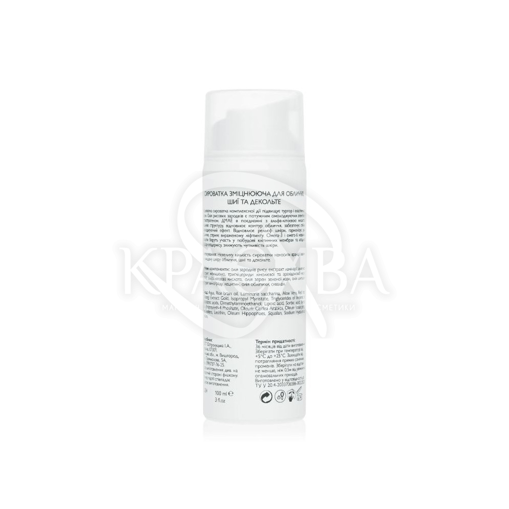 Опис: Укріплююча сироватка комплексної дії підвищує тургор і еластичність шкіри, що в'яне. Олія рисових зародків є потужним омолоджуючим агентом - фітоестрогеном. ДМАЕ у поєднанні з альфа-ліпоєвою кислотою зміцнює структуру, відновлює контур обличчя, забезпечує стійкий ефект, що омолоджує. Відновлює рельєф шкіри, гармонізує риси обличчя, сприяє вираженому ліфтингу. Омега-3 та омега-6 незамінні кислоти беруть участь у побудові клітинних мембран та ліпідного бар'єру епідермісу, знижують чутливість шкіри.