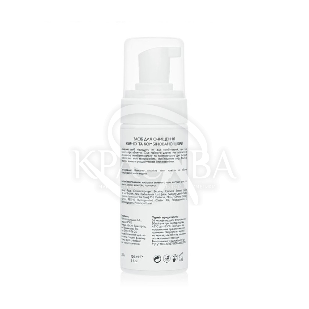 Опис: Делікатний засіб у формі мусу підходить як для комбінованої, так і для жирної шкіри обличчя. Олія чайного дерева має антисептичну, дезінфікуючу, антибактеріальну та протизапальну дію. Відмінно сприймається навіть дуже проблемною шкірою з багатьма проявами акне. Екстракти зеленого чаю та алое заспокоюють та пом'якшують шкіру. Пантенол і алантоїн знімають подразнення та почервоніння. Підходить для очищення шкіри будь-якої вікової категорії.