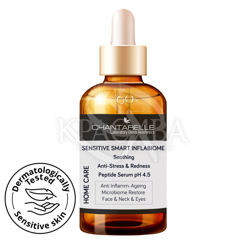 Опис: Антистресова заспокійлива сироватка для чутливої шкіри pH 4,5 з пептидом, проти почервоніння та запалення старіння, що регенерує мікробіом. Призначений для обличчя, шиї та під очима чутливої шкіри.