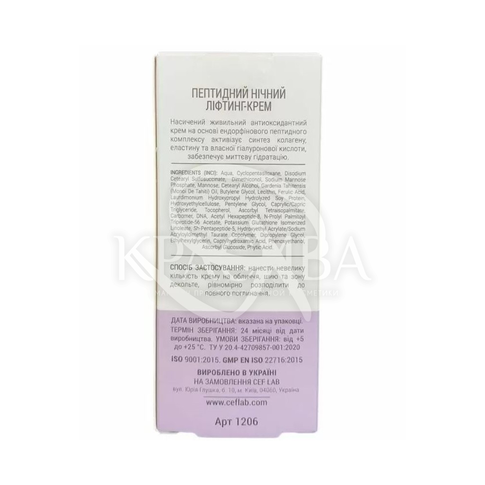 Опис: Насичений живильний антиоксидантний крем на основі ендорфінового пептидного комплексу активізує синтез колагену, еластину та власної гіалуронової кислоти, забезпечує миттєву гідратацію. Препарат надає шкірі підтягнутого вигляду, забезпечує ліфтинг, а також зменшує вираженість дрібних і глибоких зморшок, покращує тон і текстуру шкіри, звужує пори.