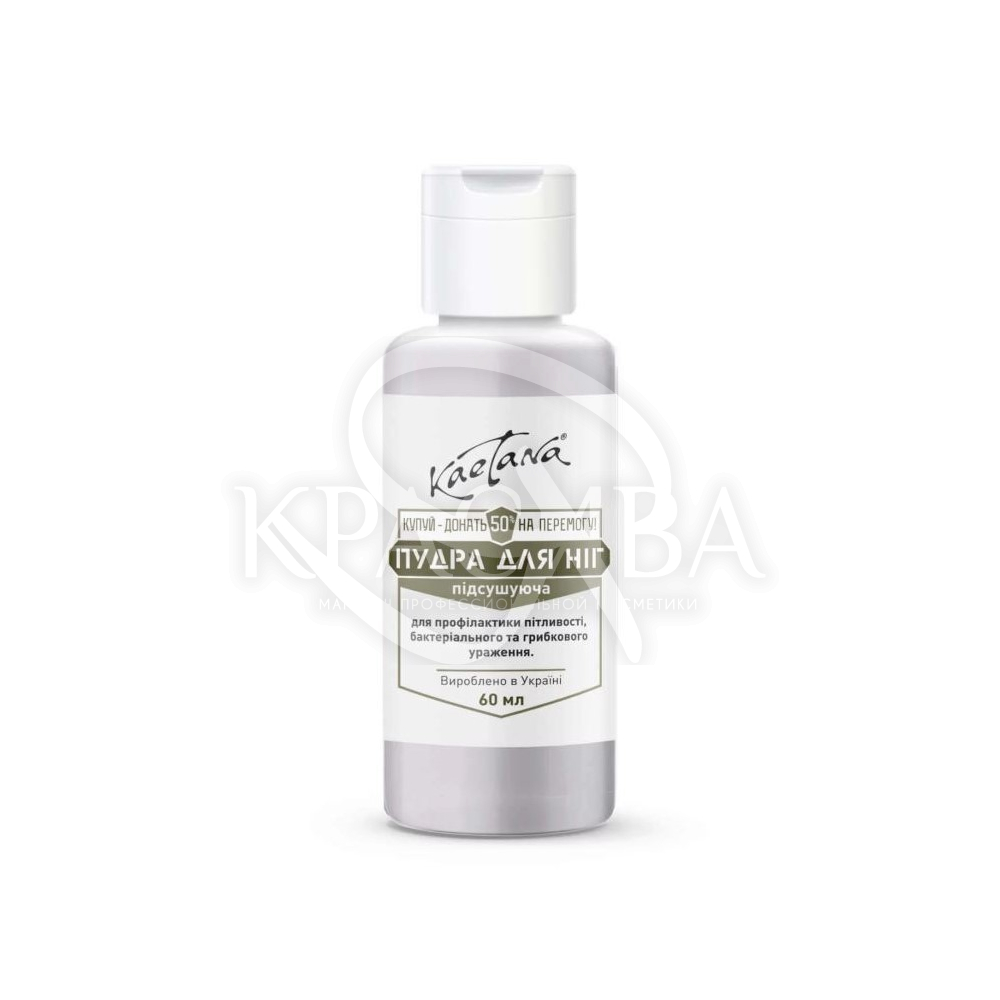 Опис: Пудра для ніг підсушує шкіру та шкарпетки, зменшує пітливість, дезодорує взуття, бореться з бактеріальним та грибковим ураженням стоп, знімає роздратування, відчуття печіння стопи, відлущує натоптиші та старі мозолі, робить шкіру стопи більш ніжною та доглянутою.