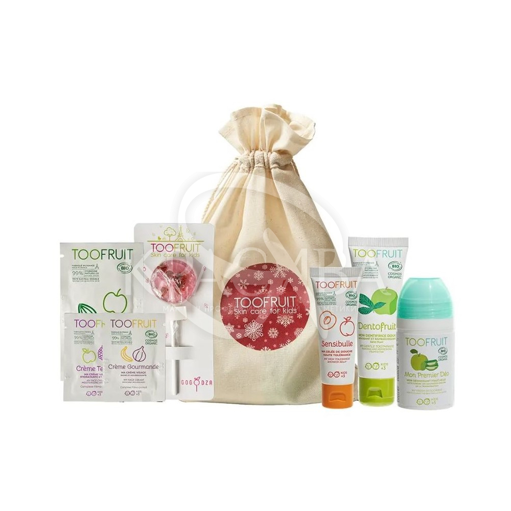 Опис: Цей святковий набір обов'язково порадує всіх дітей! Органічні продукти, що входять до набору, привчать дітей першим правилам гігієни і подарують круті засоби по догляду. У боксі містяться продукти, які задовольнять потребу у першому догляді за тілом. Економний бокс принесе справжнє задоволення усій вашій родині. Подаруйте радість собі та близьким! – Мій перший Део: органічний та безпечний дезодорант у вигляді ролика, без спирту та алюмінію у складі. Антибактеріальні речовини перешкоджають появі запаху поту, а екстракт бамбука регулює зайве потовиділення. – Зубна паста: Безпечний продукт без фтору. Відмінно очищає дитячі зуби від нальоту та допомагає боротися з карієсом. Зі смаком яблук та м'яти. - Мініатюра Геля для душу: Глибоко очищає шкіру, не викликаючи сухості, дарує відчуття комфорту та легкості. – Смачний сюрприз – 3 зразки