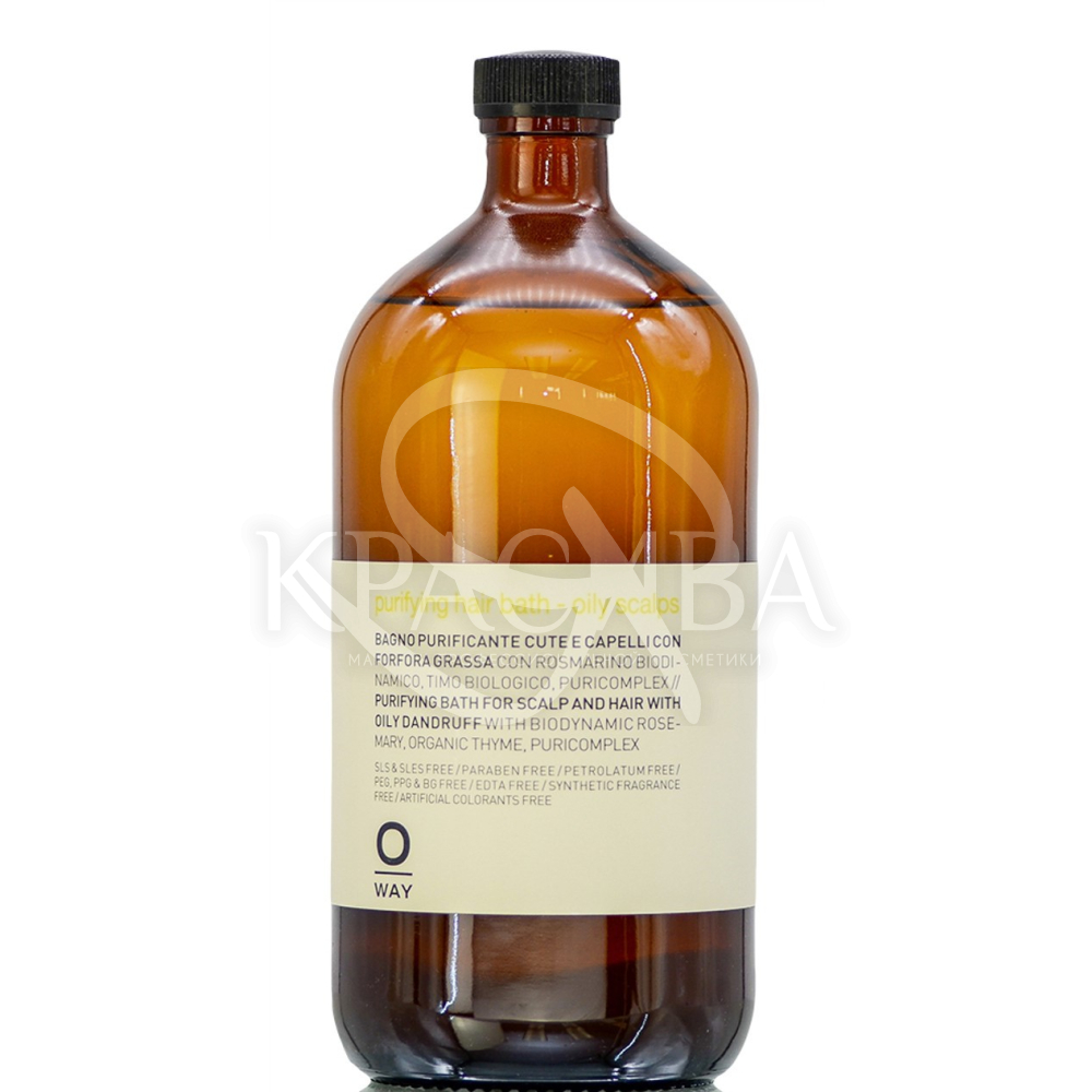 Ефект шампуню Oway Purifying Oily Scalps для жирного волосся та проти усунення лупи заснований на дії рослинних екстрактів на біохімію шкіри голови. Тік, махагон (червоне дерево), лопух і розмарин завдяки значній концентрації танінів чудово очищають всю шкіру та волосся, згубно діють на бактерії та віруси, тонізують клітини, стимулюють внутрішньоклітинний обмін речовин, виявляють антибактеріальну та протизапальну дію. Чебрець нормалізує метаболізм, регулює кількість води, усуває лущення та почервоніння, ефективно бореться з лупою, попереджаючи її подальшу появу. Комплекс Phycosaccaride ACG, джерелом якого служить ламінарія, зменшує виділення себуму, пригнічує життєдіяльність патогенних організмів, які викликають появу лупи та посилює регенерацію, оздоровлюючи шкірний покрив.