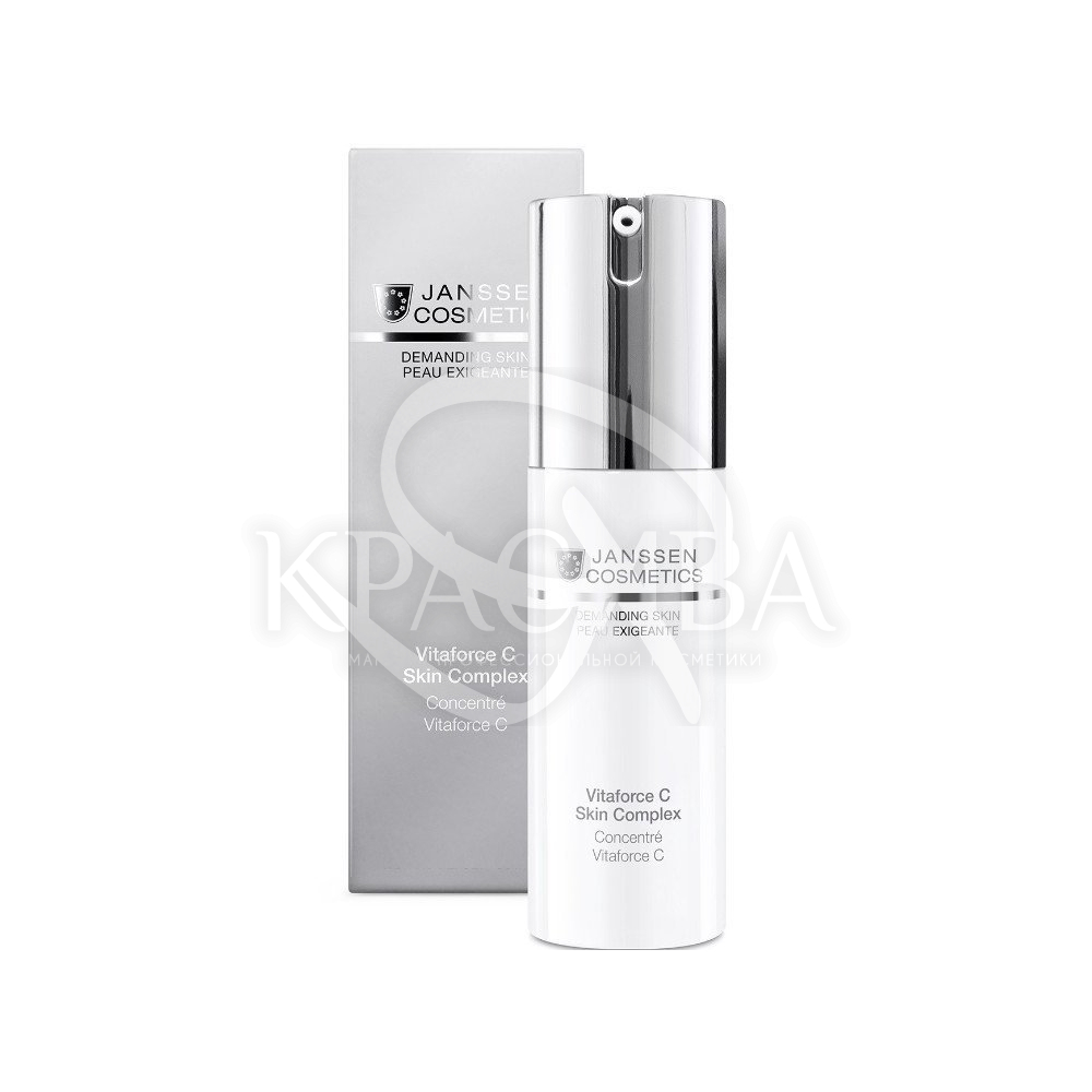 Гіалуронова кислота покращує тонус шкірного покриву, розгладжує зморшки та зволожує, а натуральний екстракт лимона має освіжаючий та тонізуючий вплив. Регенеруючий концентрат Janssen Cosmetics Vitaforce C Skin Complex має приємний аромат і має легку шовковисту консистенцію.