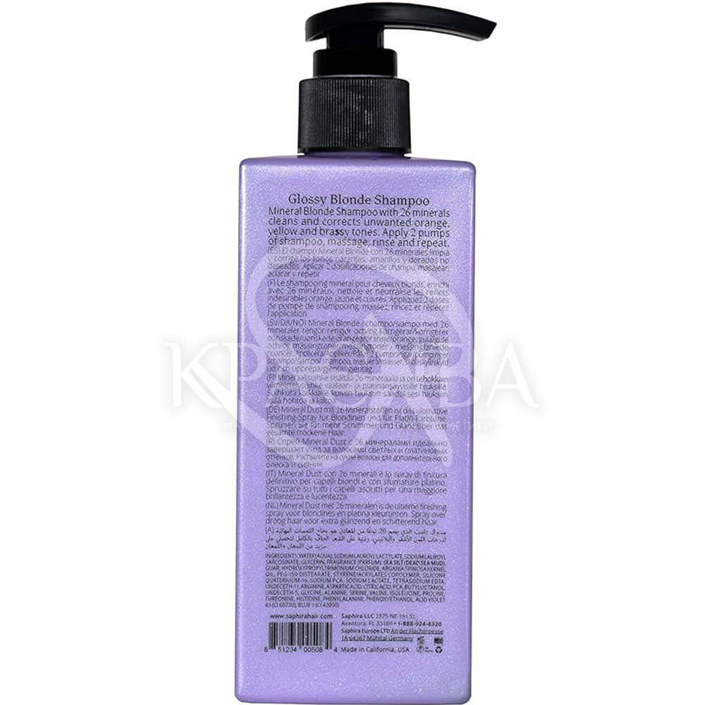 Опис: Шампунь має ряд явних переваг, які роблять його незамінним у догляді за блондованим волоссям. Головна особливість – його здатність нейтралізувати жовті та помаранчеві відтінки, які часто з'являються на освітленому волоссі. Це досягається завдяки наявності фіолетових пігментів, які ефективно нейтралізують теплі відтінки, надаючи волоссю благородний холодний блонд. Крім того, шампунь має глибоко зволожуючі властивості завдяки екстракту кокосу та соняшниковій олії. Ці компоненти активно живлять волосся, запобігаючи його зневодненню і надаючи їм м'якість. Соняшникова олія захищає волосся від шкідливих зовнішніх факторів, таких як забруднення та ультрафіолет, а кокосова олія відновлює структуру волосся і робить його більш еластичним. Склад шампуню посилено 26 активними мінералами Мертвого моря. Ці мінерали сприяють відновленню пошкодженого волосся, зміцнюють його і покращують текстуру, надаючи локонам блиск і здоровий вигляд. Вони також підтримують оптимальний рівень зволоженості, запобігаючи сухості та ламкості, які можуть виникнути після освітлення.